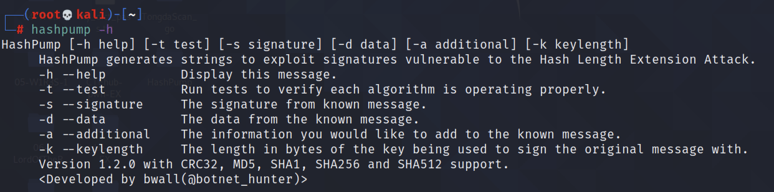 -s或--signature:从已知消息中获取的签名(哈希值)。-d或--data:已知消息的数据。-a或--additional:你想要添加到已知消息中的信息。-k或--keylength:用于签署原始消息的密钥的字节长度。