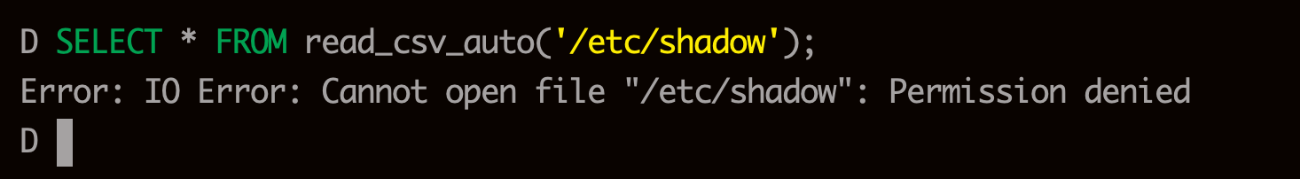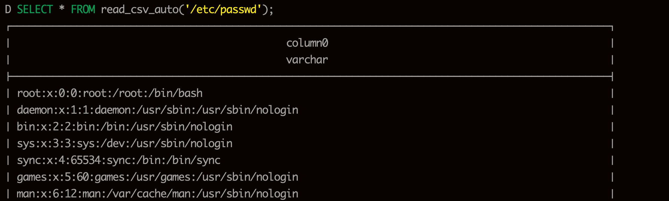 由于没有对SQL查询字符串做过滤限制,导致恶意的SQL语句直接传递到DuckDB执行。