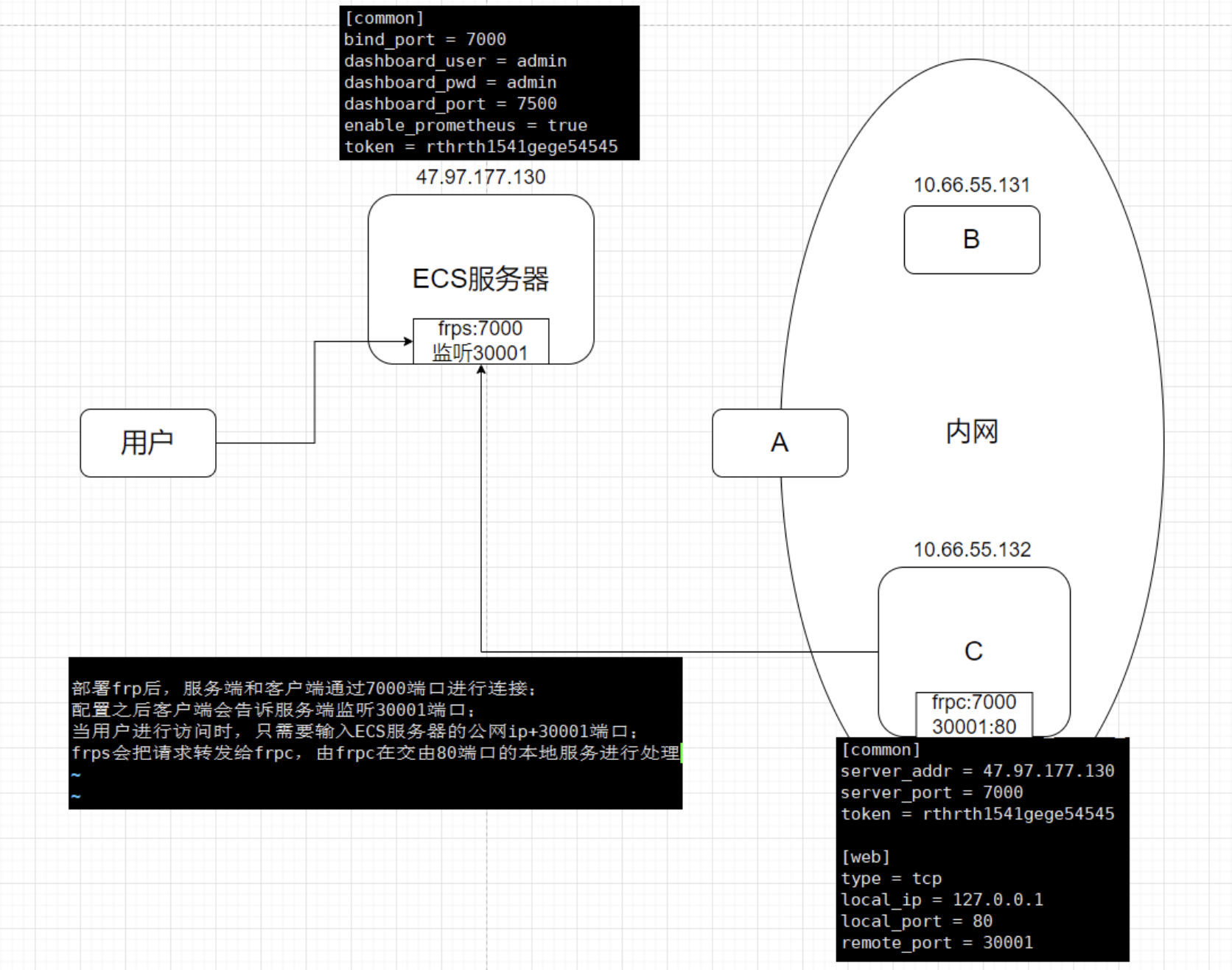 图中,内网本地的127.0.0.1:80端口的web服务通过客户端配置,映射到VPS上的47.97.177.130:30001端口。后续流量从本地80端口转发到frpc,frpc通过vps的7000端口转发给vps,vps在把流量转发到30001端口,如此便实现了内网服务在外网的暴露,外网用户可以从外网访问到内网的80端口的服务。