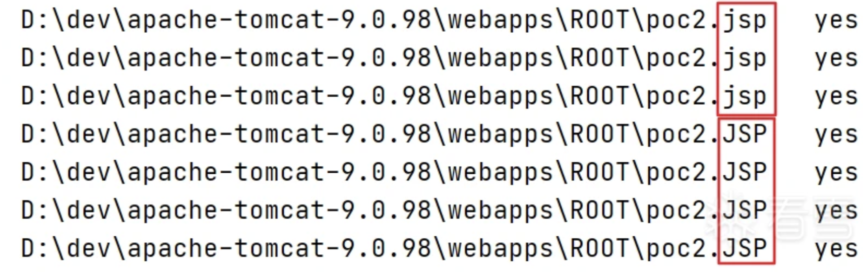 .jsp变为.JSP之前利用这个漏洞,因为过了这个时间差之后,file.getCanonicalPath获取的值就变成了大写结尾的路径,但调用file.getAbsolutePath()方法依然会返回小写结尾的路径,导致后续的路径检查失败,Tomcat会返回404错误。
