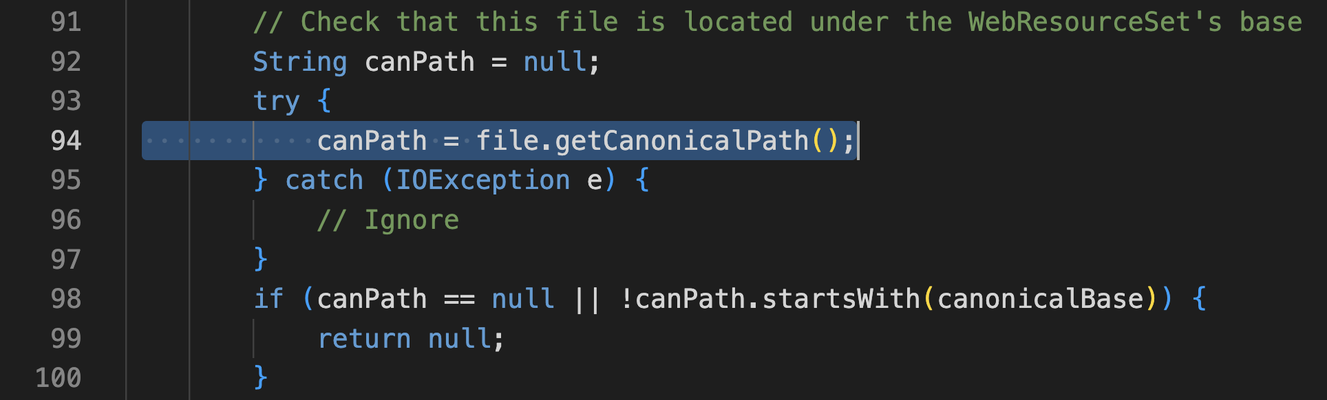 在tomcat源码中,org.apache.catalina.webresources.AbstractFileResourceSet#file 方法第94行调用了getCanonicalPath方法