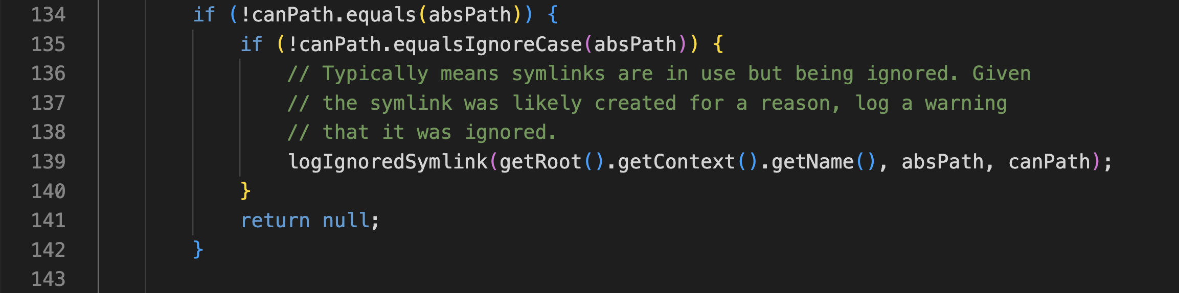 因为过了这个时间差之后,file.getCanonicalPath 获取的值就变为了 *.JSP 大写结尾的路径,但调用 file.getAbsolutePath() 方法依然会返回 *.jsp 小写结尾的路径,于是 file 方法第141行的equals方法会返回false,再取反为true,于是执行到145行返回一个null: