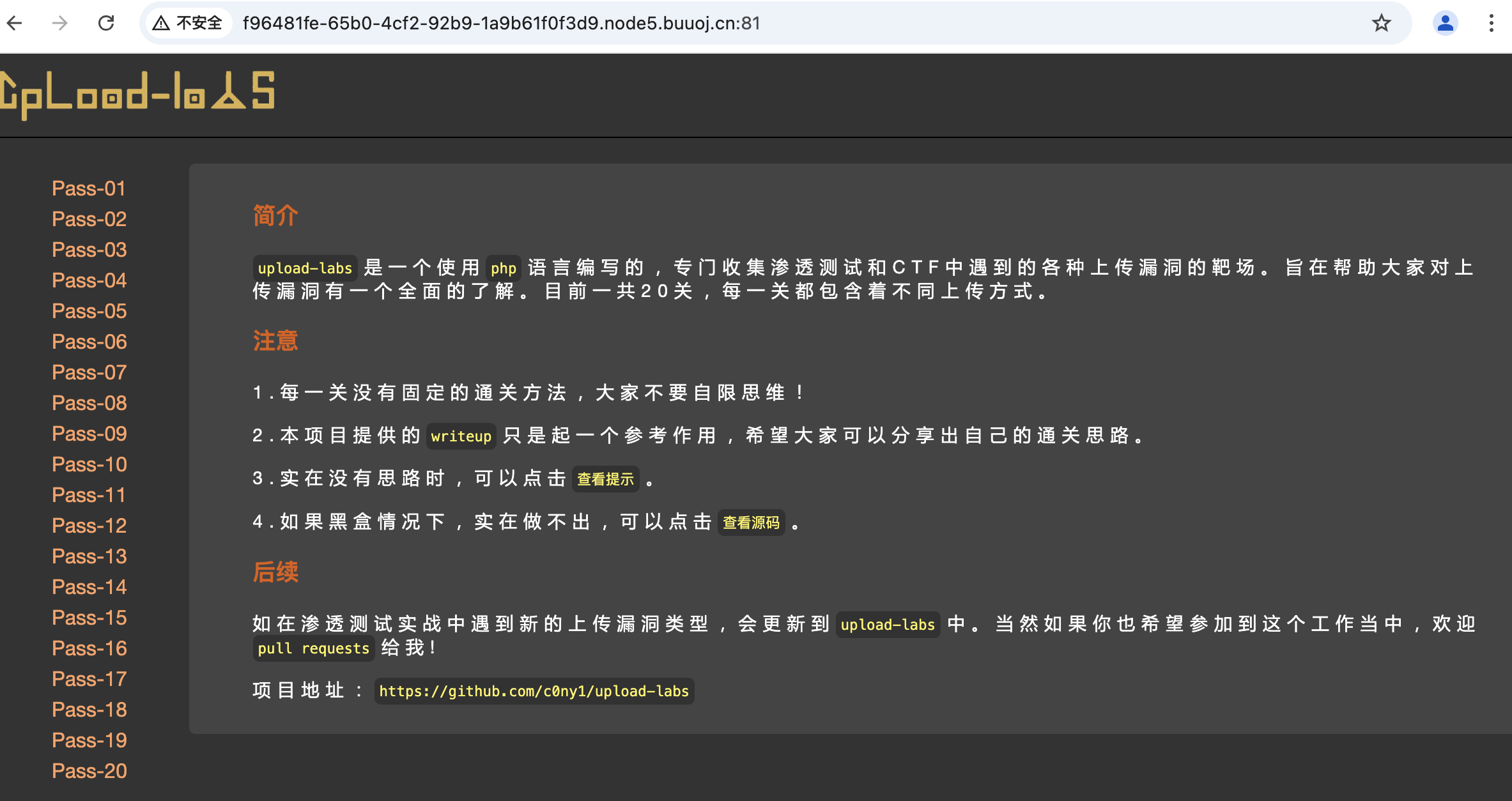 buuoj upload-labs靶场(目前20关)链接:https://buuoj.cn/challenges#Upload-Labs-Linux ,靶场其实是一个部署在Linux环境中的Upload-Labs(玩过文件上传的应该都接触过这个靶场)。