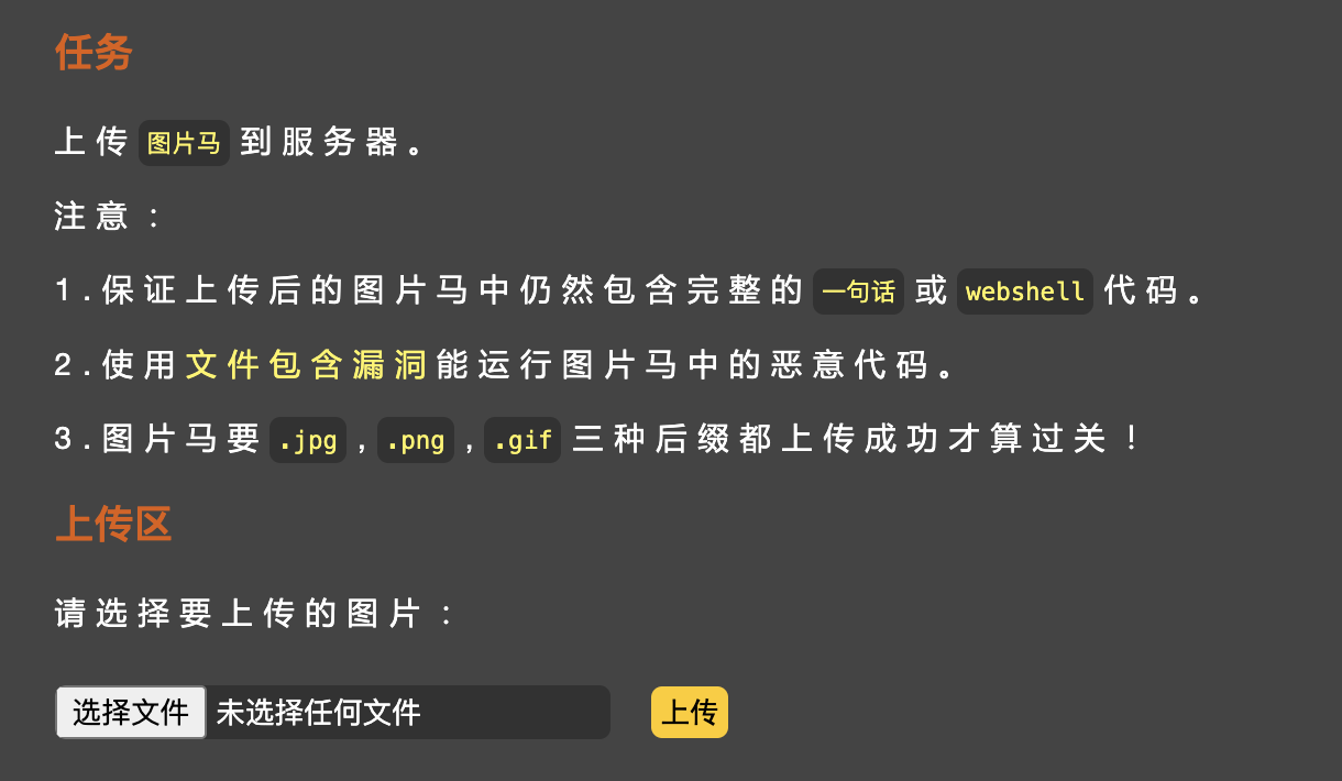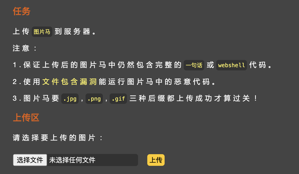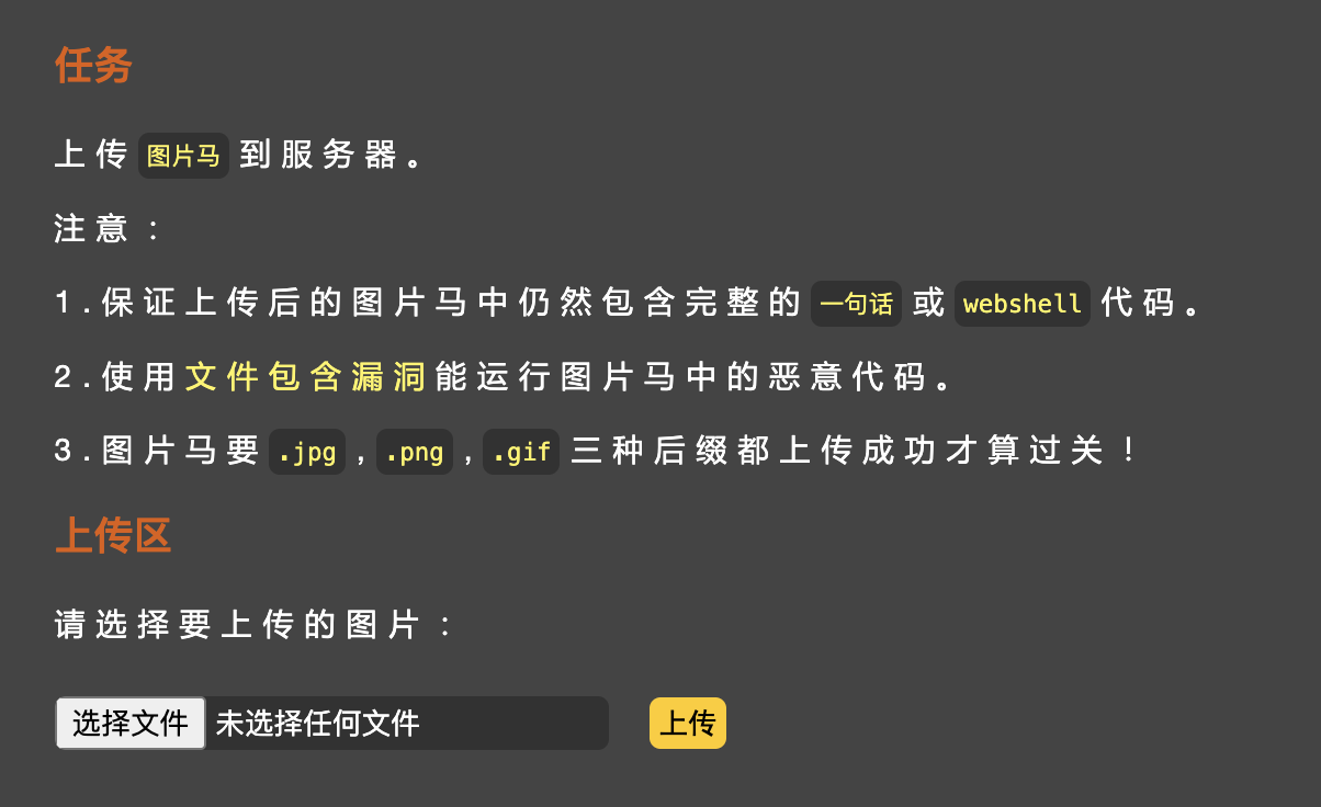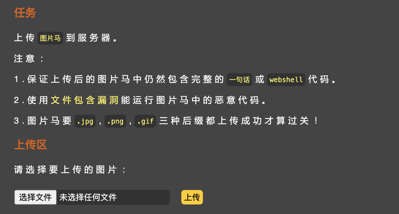 项目原始链接:https://github.com/c0ny1/upload-labs ,buuoj的靶场有些关卡有问题,最好还是自己搭建一下环境,另外需要注意的是有些关卡对操作系统类型(windows/linux)和PHP的版本是有限制的。