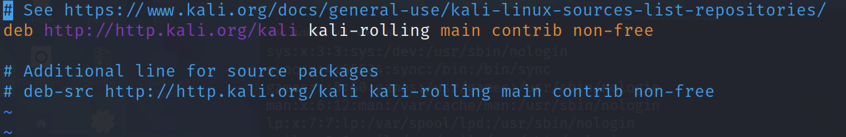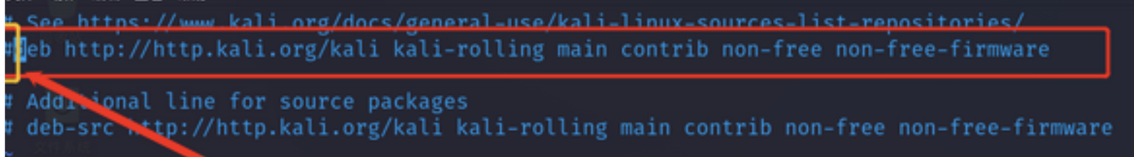 # aliyun 阿里云 deb http://mirrors.aliyun.com/kali kali-rolling main non-free contrib deb-src http://mirrors.aliyun.com/kali kali-rolling main non-free contrib # ustc 中科大 deb http://mirrors.ustc.edu.cn/kali kali-rolling main non-free contrib deb-src http://mirrors.ustc.edu.cn/kali kali-rolling main non-free contrib #deb http://mirrors.ustc.edu.cn/kali-security kali-current/updates main contrib non-free #deb-src http://mirrors.ustc.edu.cn/kali-security kali-current/updates main contrib non-free<br><br># 清华大学<br>deb http://mirrors.tuna.tsinghua.edu.cn/kali kali-rolling main contrib non-free<br>deb-src https://mirrors.tuna.tsinghua.edu.cn/kali kali-rolling main contrib non-free # kali 官方源 deb http://http.kali.org/kali kali-rolling main non-free contrib deb-src http://http.kali.org/kali kali-rolling main non-free contrib # 默认的直接注释掉 #deb http://security.kali.org/kali-security kali-rolling/updates main contrib non-free #deb-src http://security.kali.org/kali-security kali-rolling/updates main contrib non-free![]()