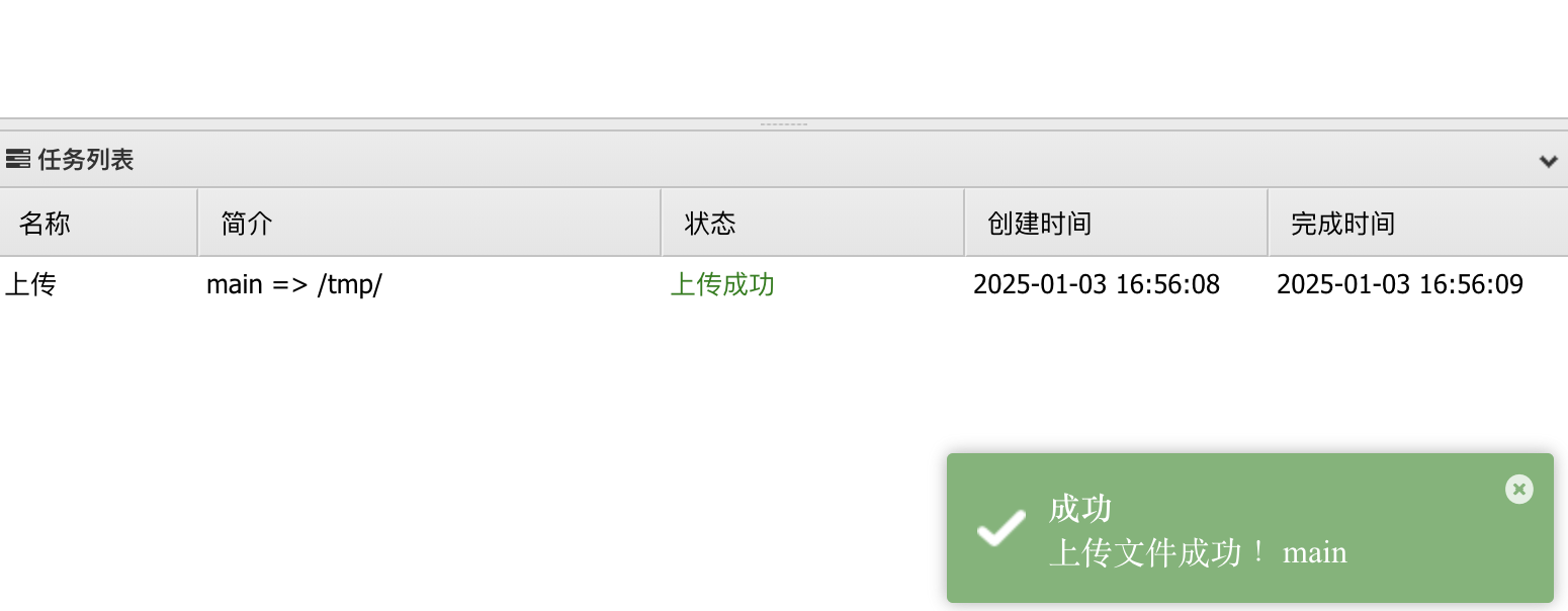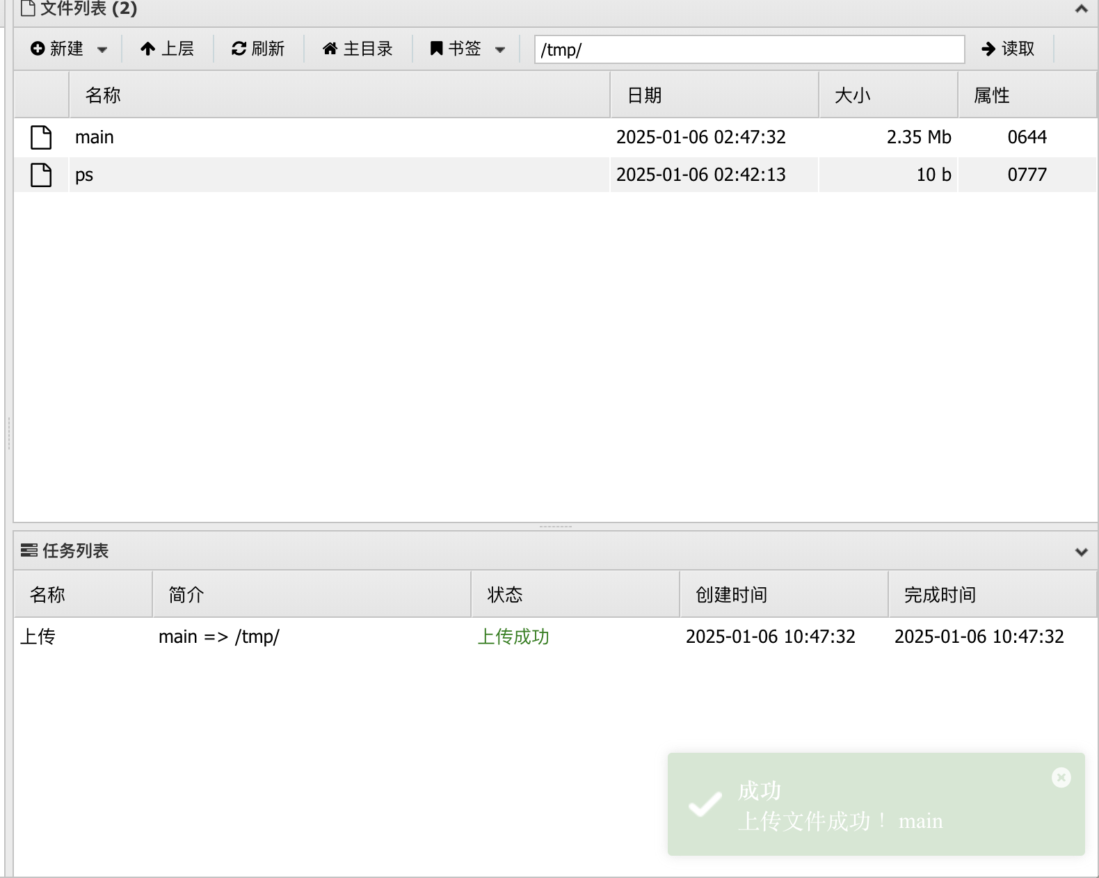 将该payload(main文件)拷贝到docker容器中(这就是模拟攻击者获取了docker容器权限,在容器中上传payload进行docker逃逸)并将main文件修改权限可执行。