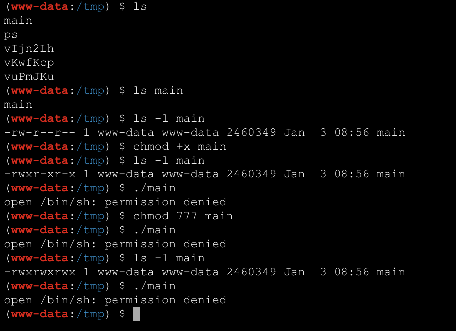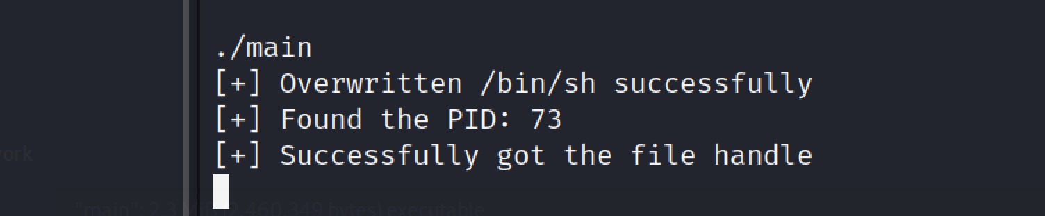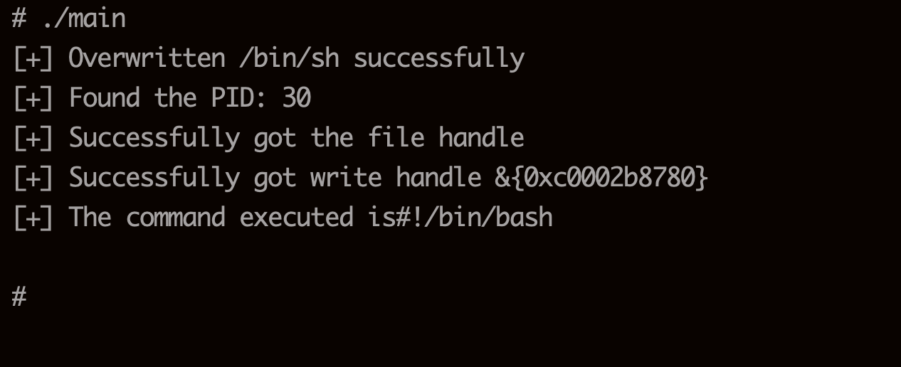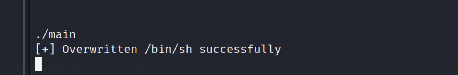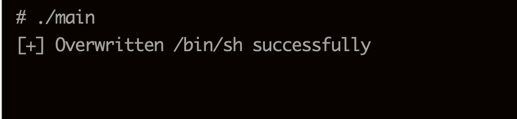 fmt.Println("[+] Overwritten /bin/sh successfully")
