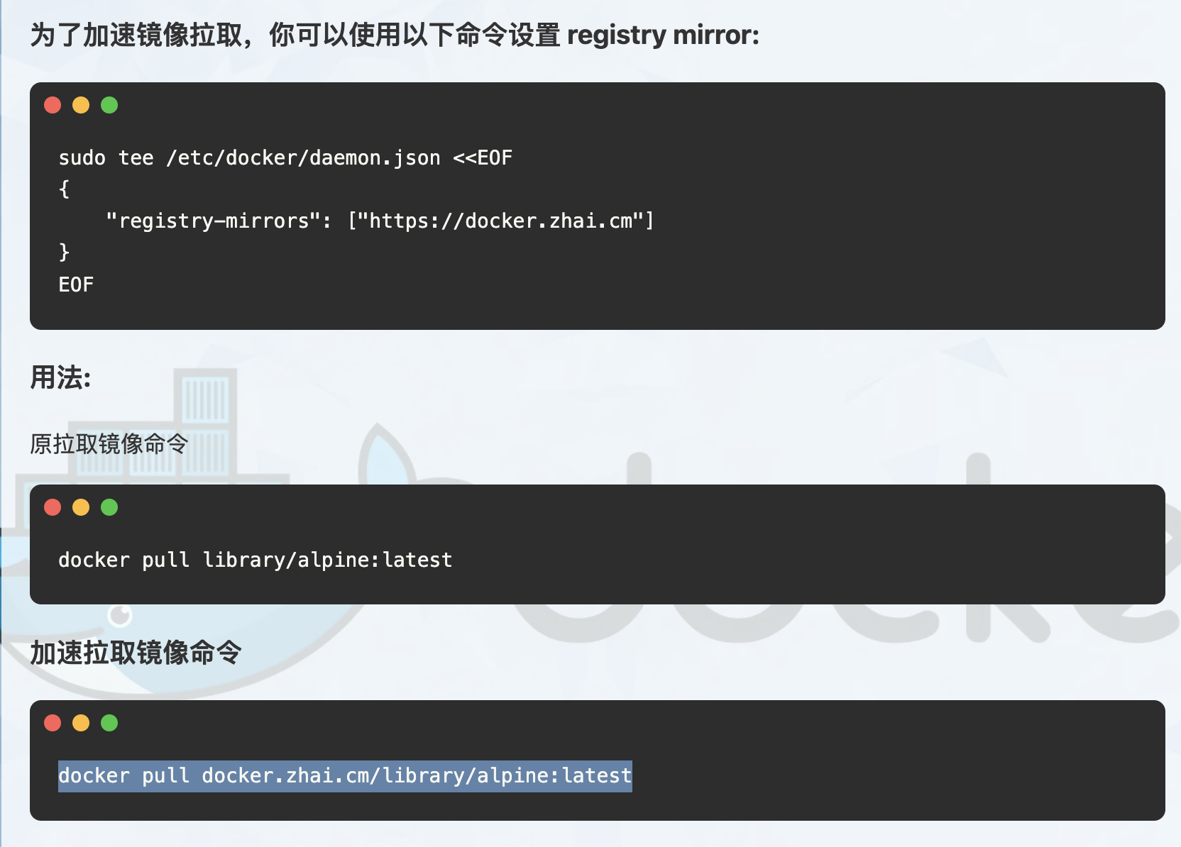sudo tee /etc/docker/daemon.json <<EOF { "registry-mirrors": ["https://docker.zhai.cm"] } EOF systemctl daemon-reload systemctl restart docker再尝试拉取一下nginx镜像。
