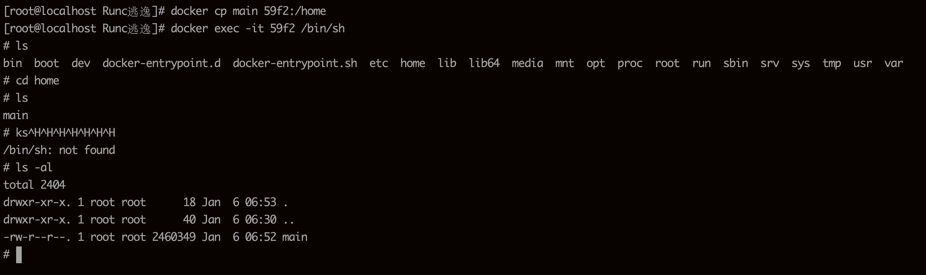 在容器的shell中执行./main,覆盖宿主机的/bin/sh文件。