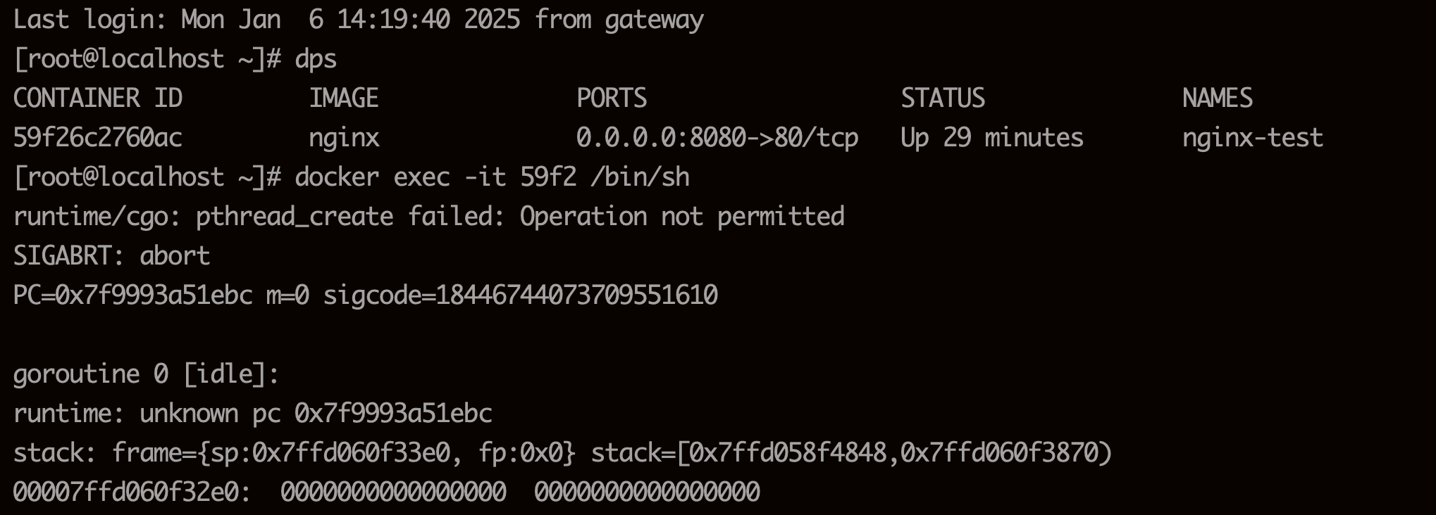 /bin/sh文件被恶意替换了。docker启动容器是调用runc运行时环境失败,所以容器也就无法启动了。所以,要意识到做虚拟机快照的重要性,可以省去很多麻烦。