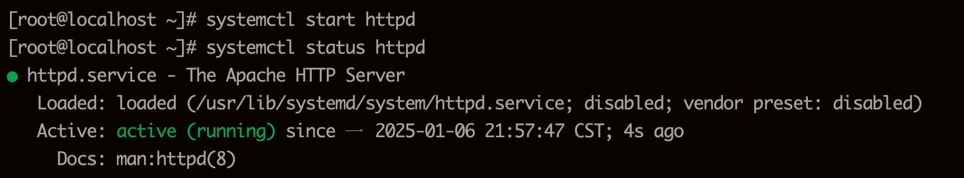 安装完成后,你可以使用 systemctl 命令来启动 Apache 服务: