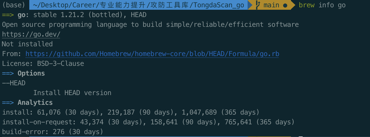 也可以输入 brew info go,可以看到返回的信息中第四行 Not installed的返回,说明了没有用brew install 安装过,如果是用brew install go 安装的go语言,会返回如下内容,内容的第四行写了安装的路径