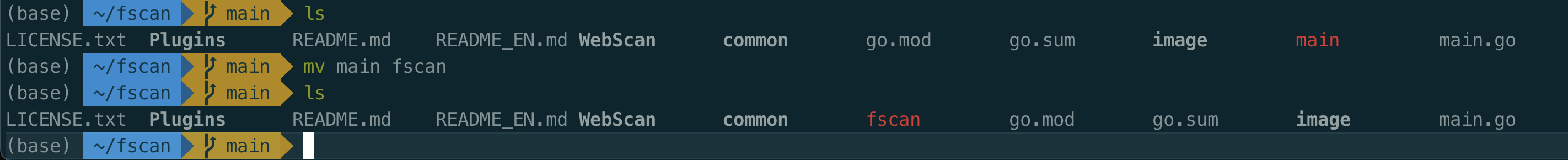首先,你需要将 main 文件重命名为 fscan。打开终端,导航到 fscan 目录,然后执行以下命令: