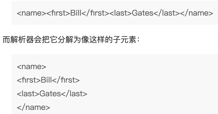解析器之所以这么做是因为 XML 元素可包含其他元素,就像这个例子中,其中的 <name>元素包含着另外的两个元素(first 和 last):