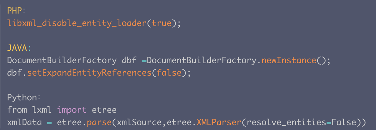 方案一:使用开发语言提供的禁用外部实体的方法(XML解析库在调用时严格禁止对外部实体的解析)