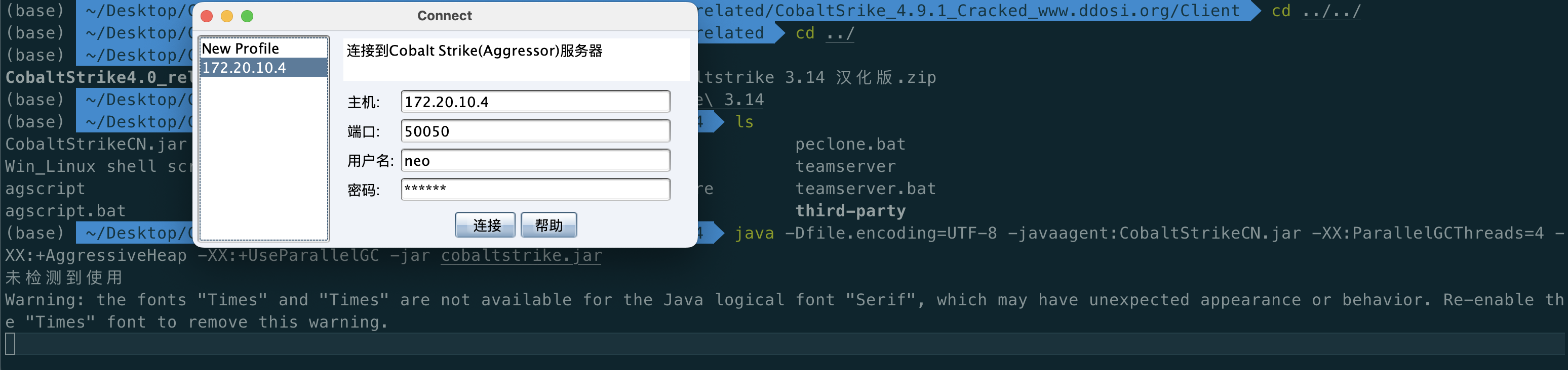 java -Dfile.encoding=UTF-8 -javaagent:CobaltStrikeCN.jar -XX:ParallelGCThreads=4 -XX:+AggressiveHeap -XX:+UseParallelGC -jar cobaltstrike.jar