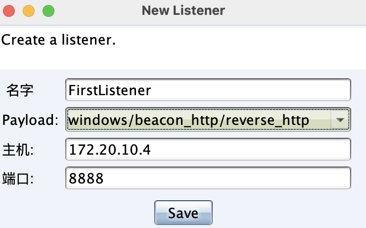 名字自定义、payload也可以根据情况选择、主机填CS服务端的IP、端口自定义。