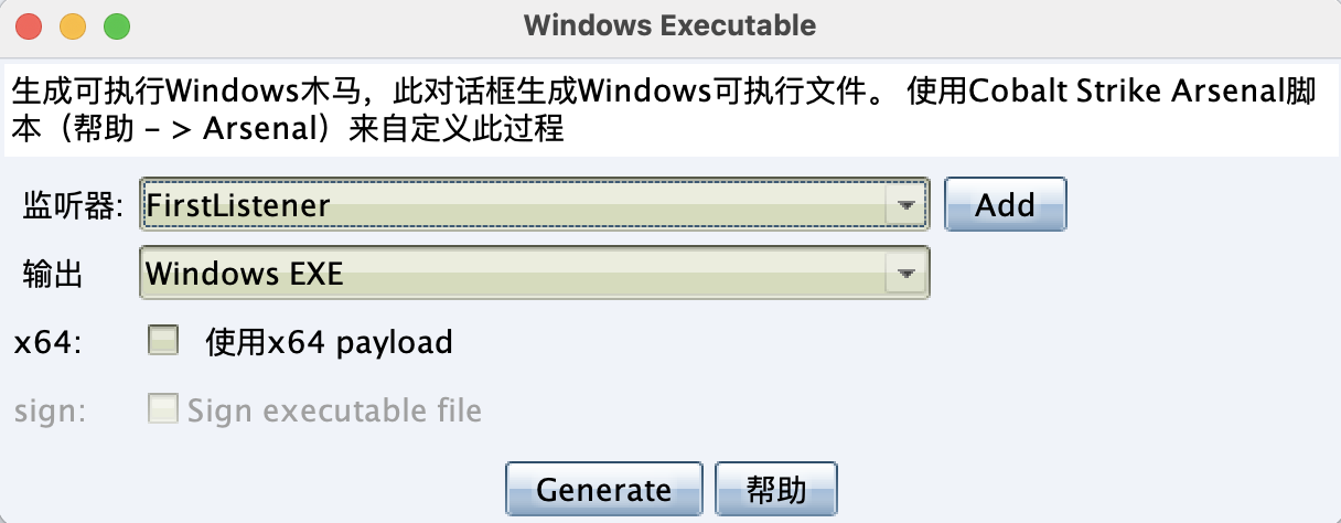 选择刚刚创建的监听器,点击generate生成后门。