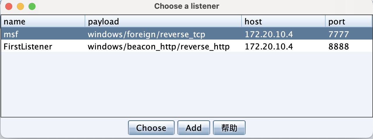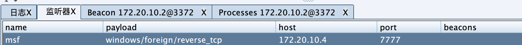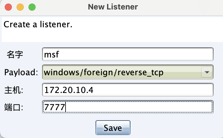 使用Cobalt Strike创建一个windows/foreign/reverse_tcp的Listener。其中ip为Metasploit的ip地址,端口为Metasploit所监听的端口。