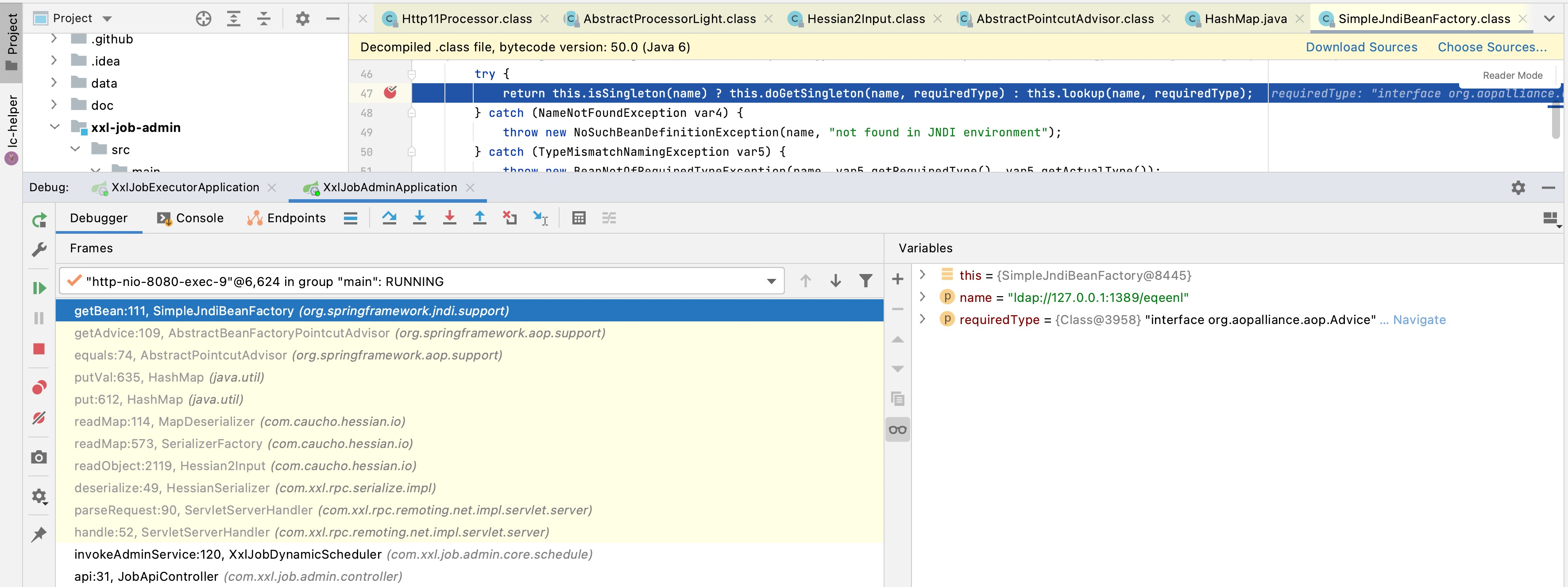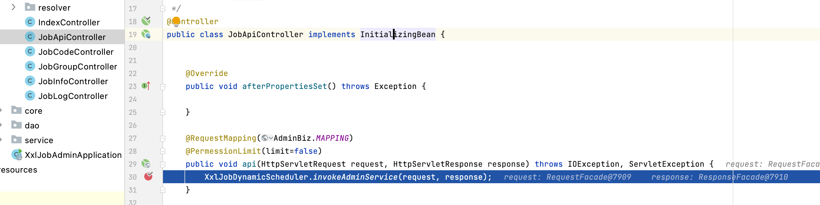 - 在JobApiController处设置断点,调试启动应用: