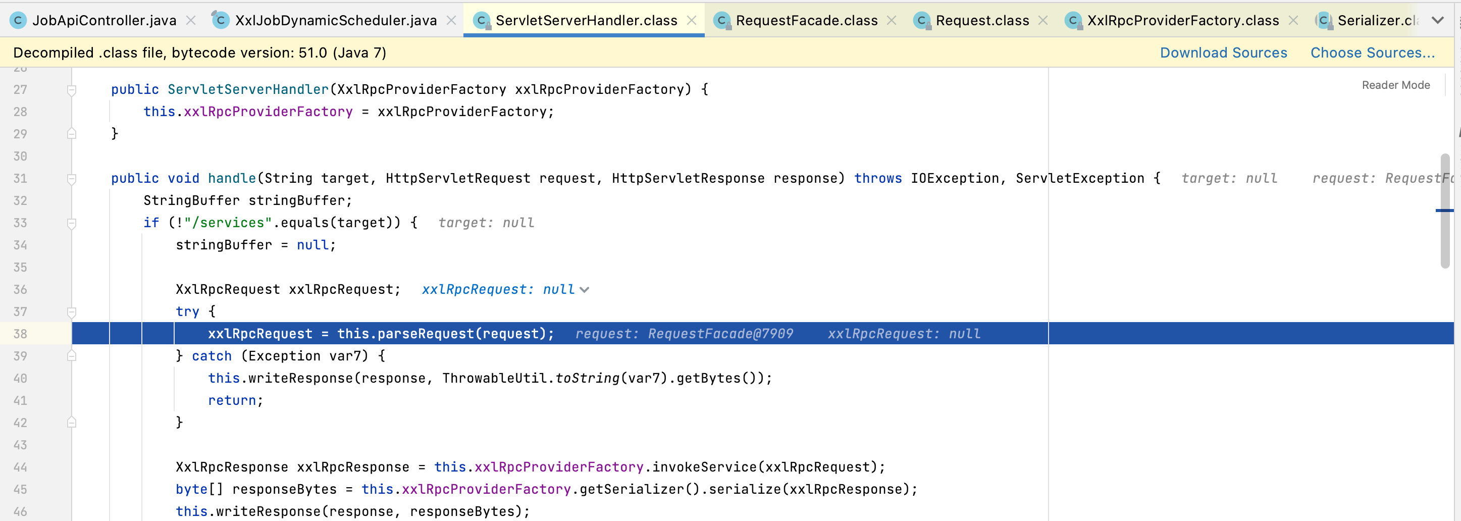 在410行步入的时候,报错“Source code does not match the bytecode”。