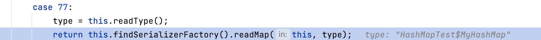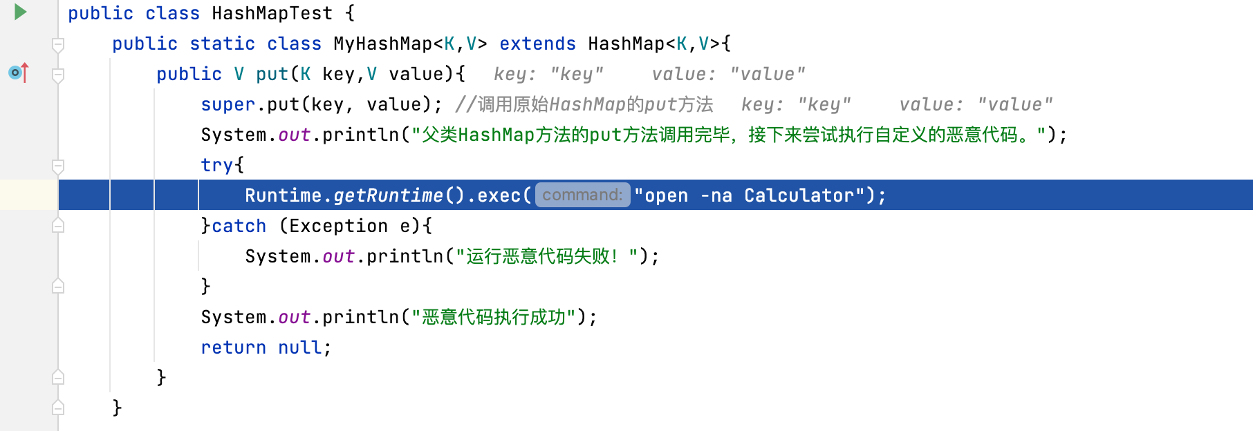 put中的两个in.readObject()是构建对象实例的过程,这个过程不会触发恶意代码的执行,关键是put方法。Map在调用put方法进行存数据的时候会调用hash函数计算冲突。