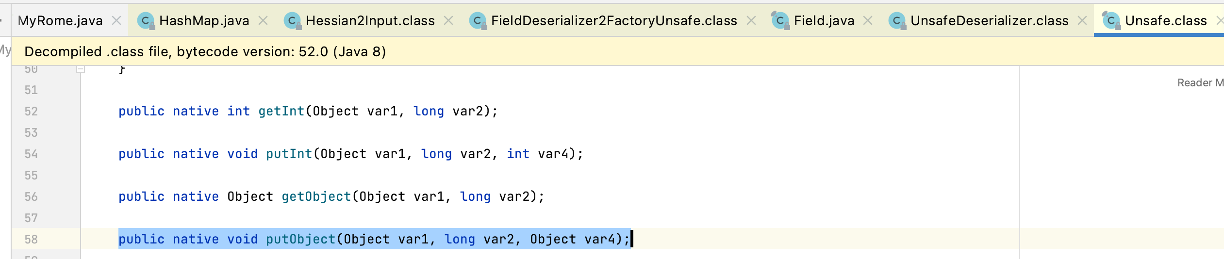 public native void putObject(Object var1, long var2, Object var4); 是 Unsafe 类中的一个 本地方法(由 native 关键字标识),其核心作用是通过 直接内存操作 修改对象字段的值。