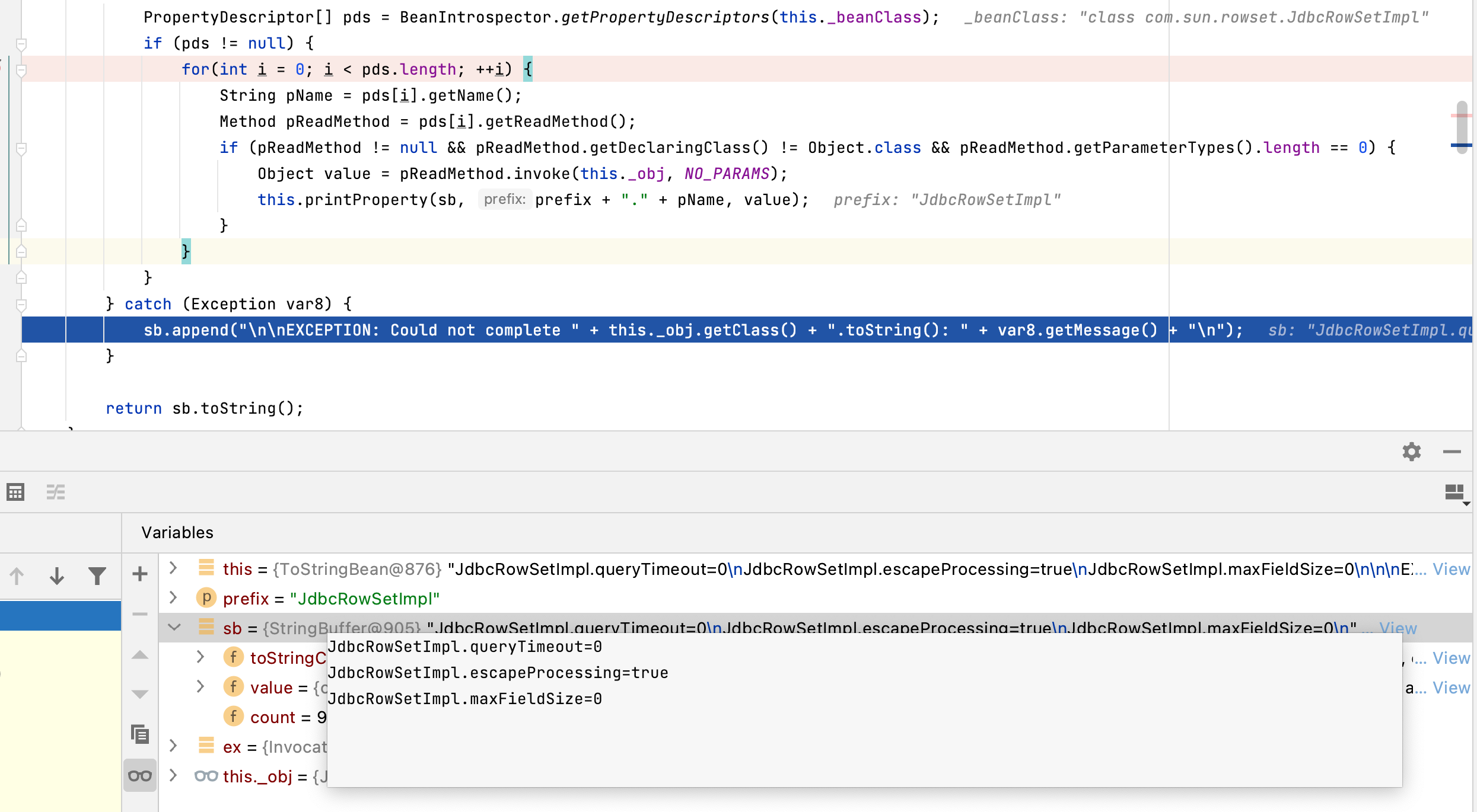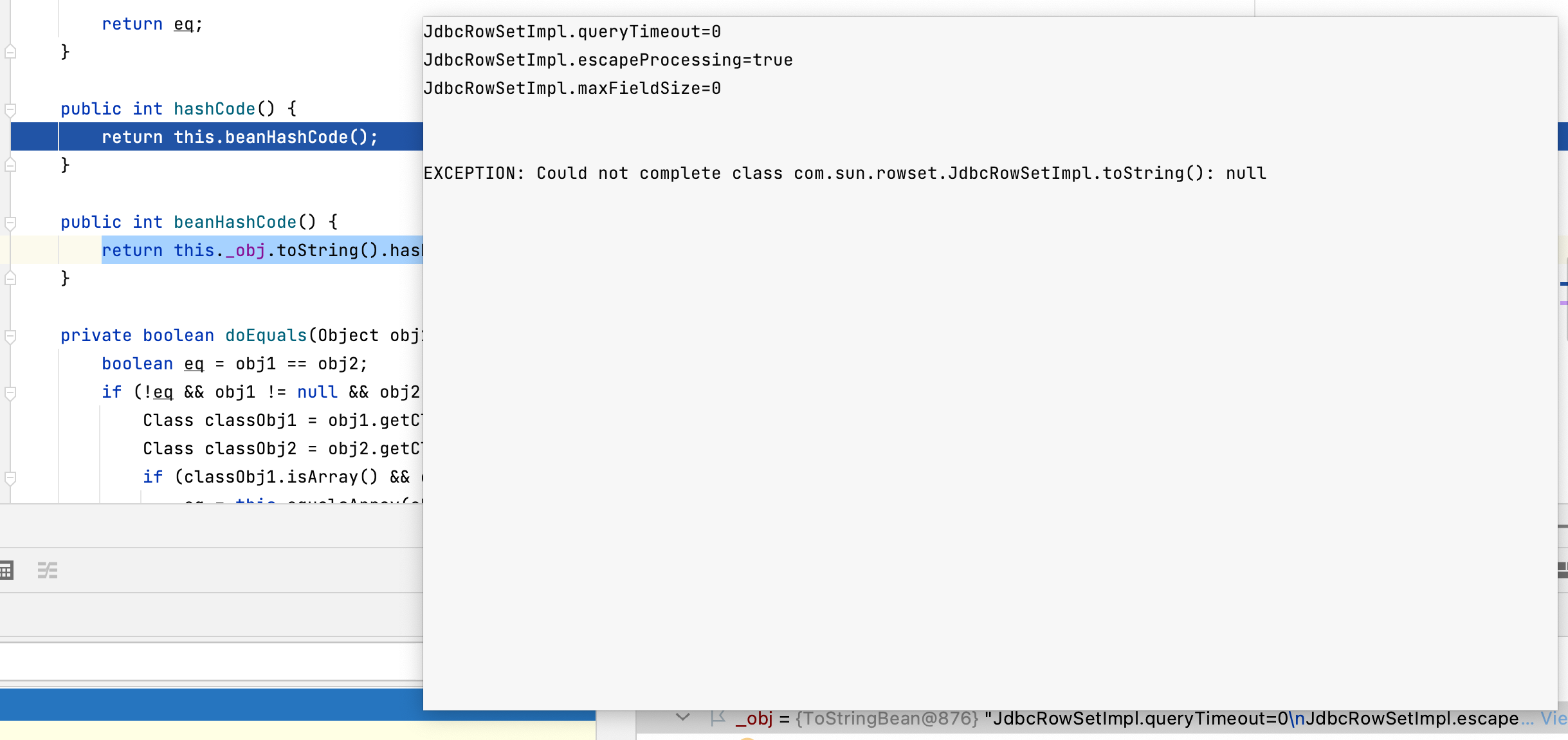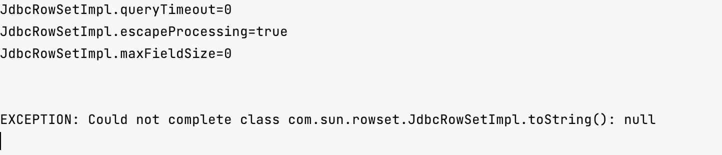 抛出的异常是:EXCEPTION: Could not complete class com.sun.rowset.JdbcRowSetImpl.toString(): null