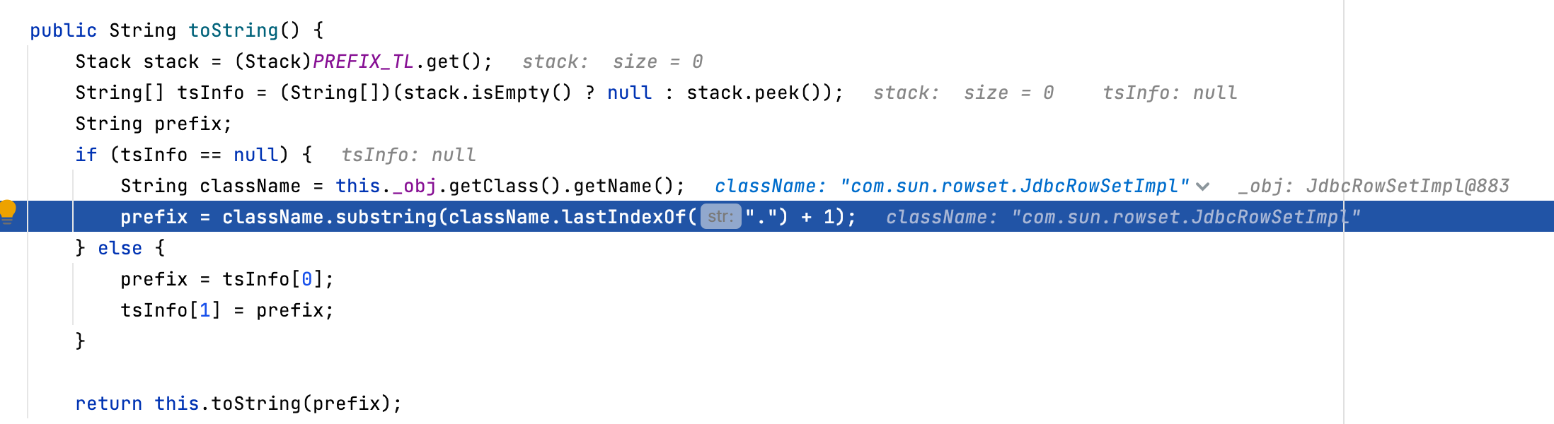 获取到JdbcRowSetImpl类名后,递归调用toString方法。