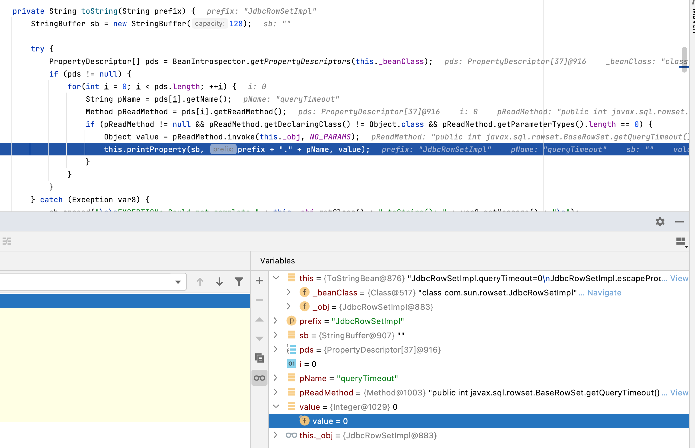 比如第一个queryTimeout属性的value为0,然后通过printProperty方法拼接到sb字符串。