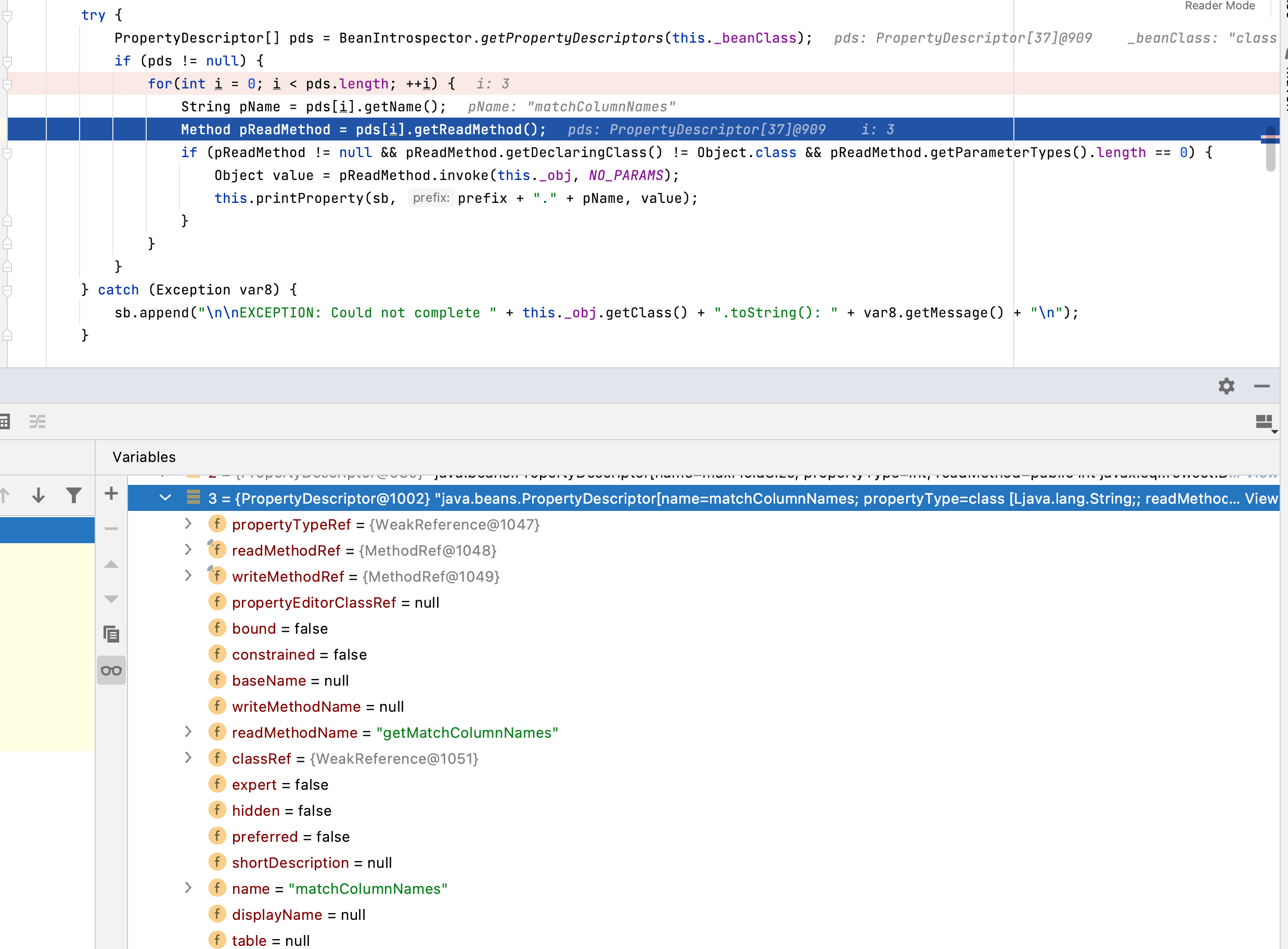 if (pReadMethod != null && pReadMethod.getDeclaringClass() != Object.class && pReadMethod.getParameterTypes().length == 0) { Object value = pReadMethod.invoke(this._obj, NO_PARAMS); this.printProperty(sb, prefix + "." + pName, value); }这段代码通过反射遍历目标对象的属性方法,筛选并调用无参getter,最终将结果格式化为字符串。