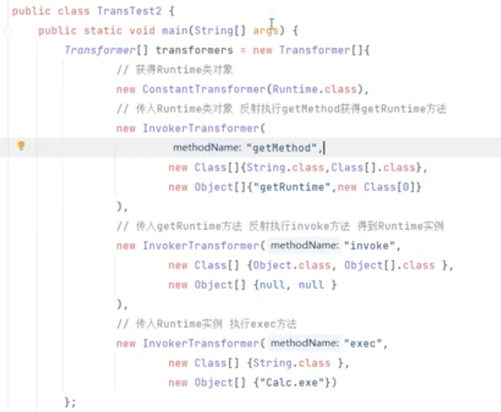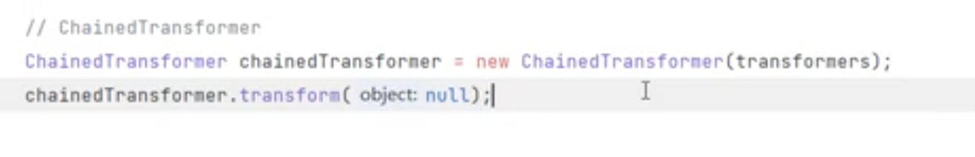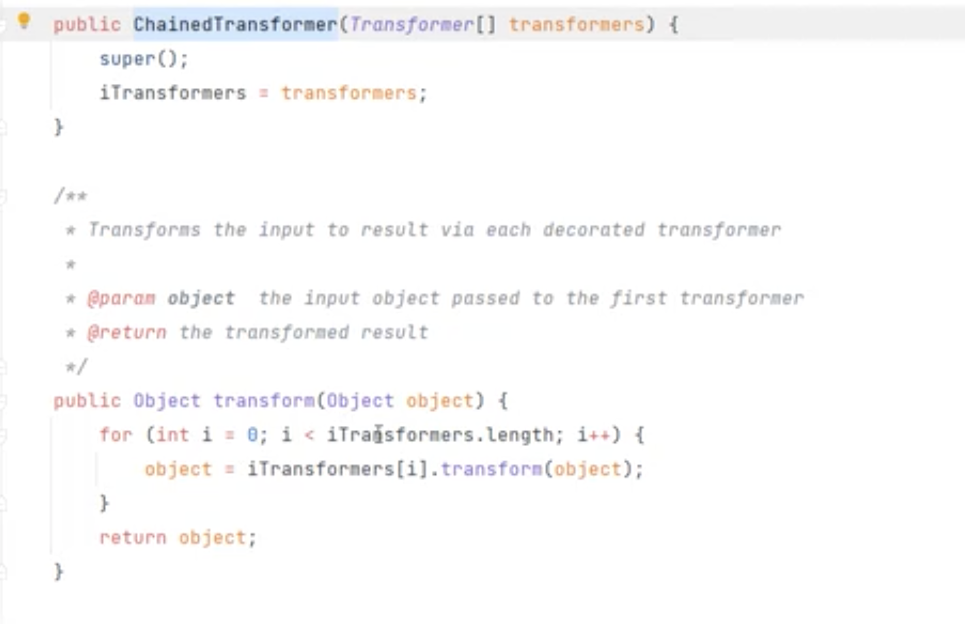 ChainedTransformer:实现了Transformer链式调用,我们只需要传入一个Transformer数组,ChainedTransformer就可以实现依次的去调用每一个Transformer的transform()方法。
