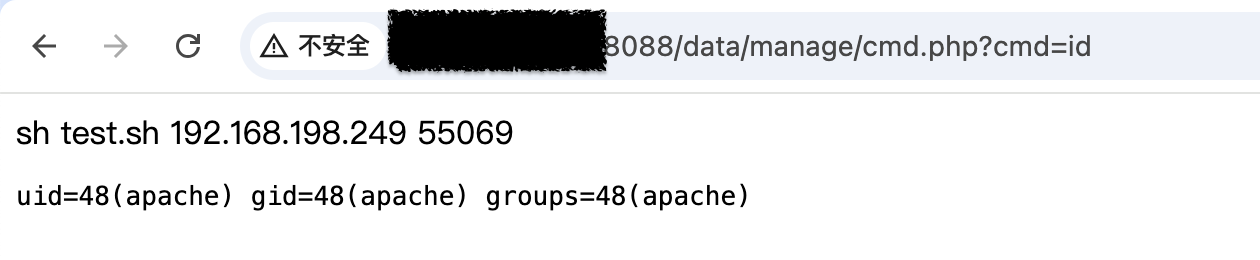 检测特征: 访问/data/manage/cmd.php?cmd=id返回包含系统用户ID(uid=)的响应